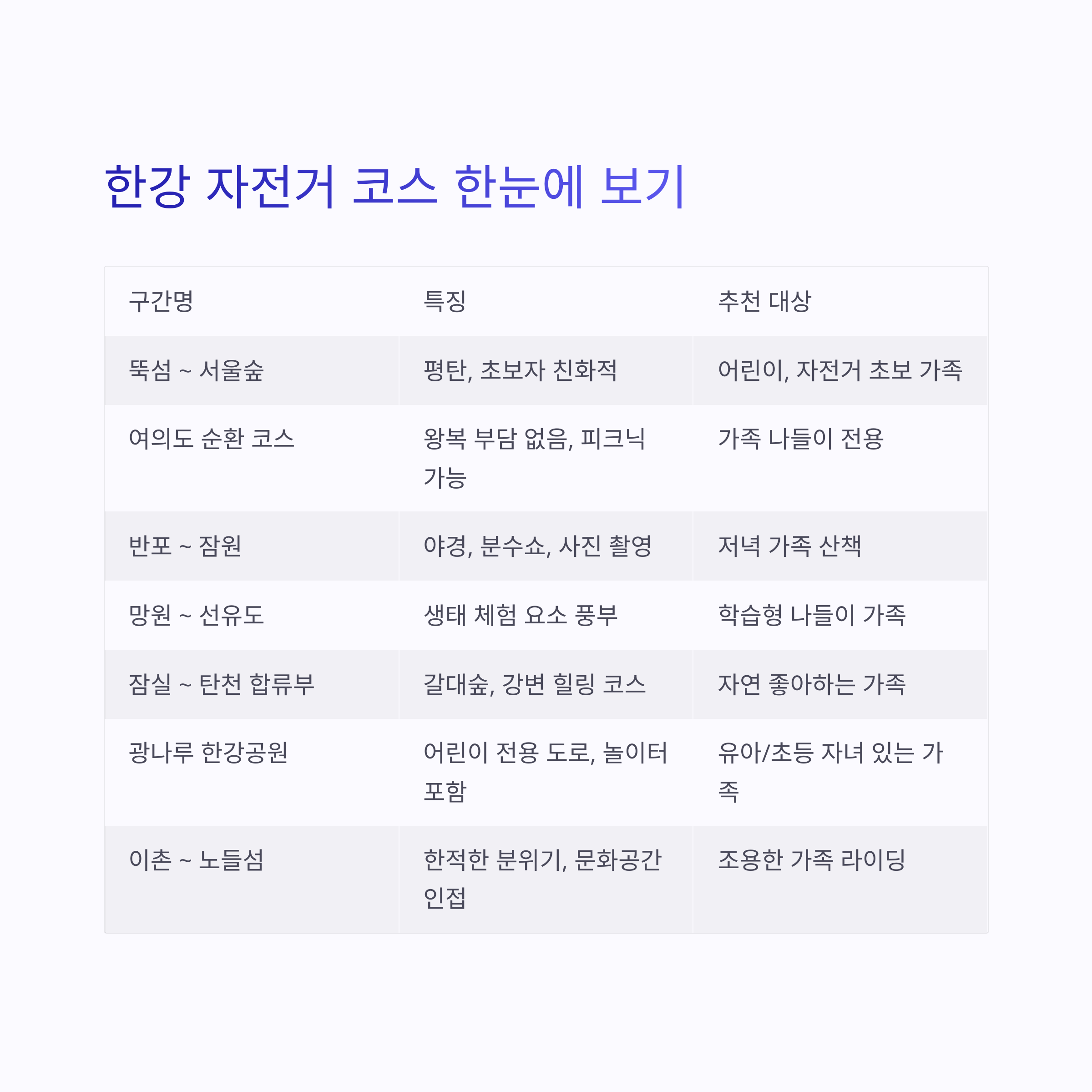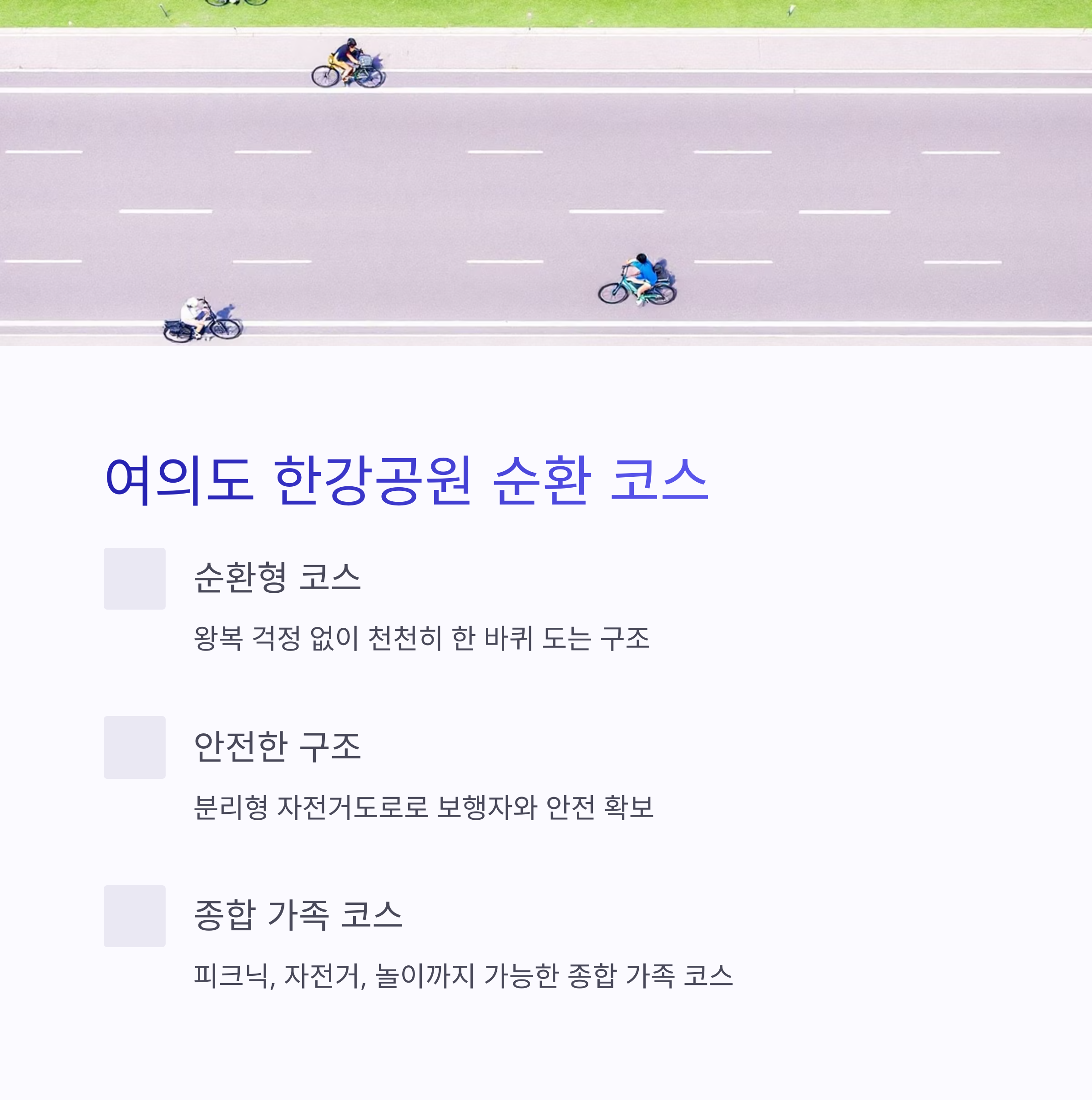 | 여의도 순환 코스 | 왕복 부담 없음, 피크닉 가능 | 가족 나들이 전용 |