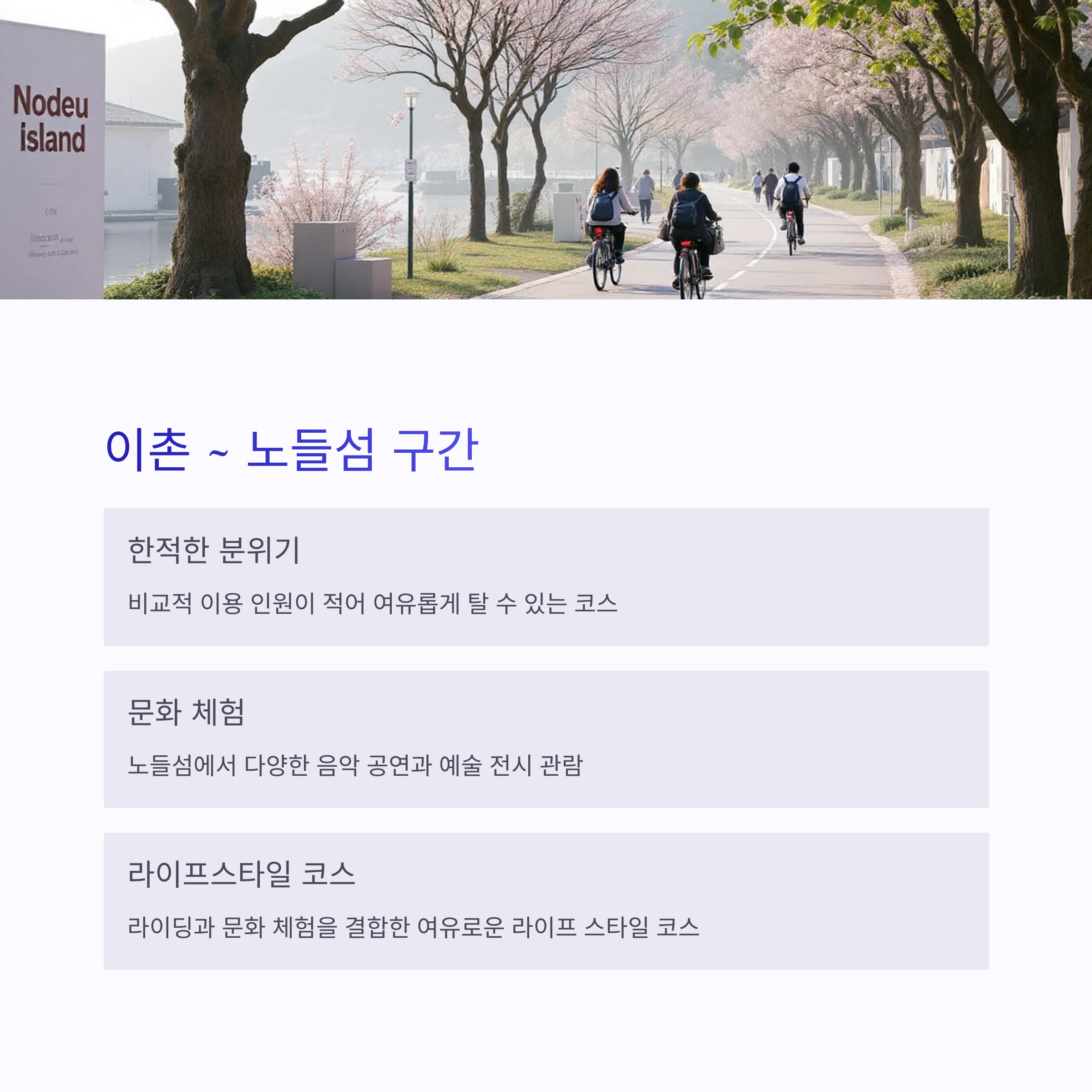 | 이촌 ~ 노들섬 | 한적한 분위기, 문화공간 인접 | 조용한 가족 라이딩 |