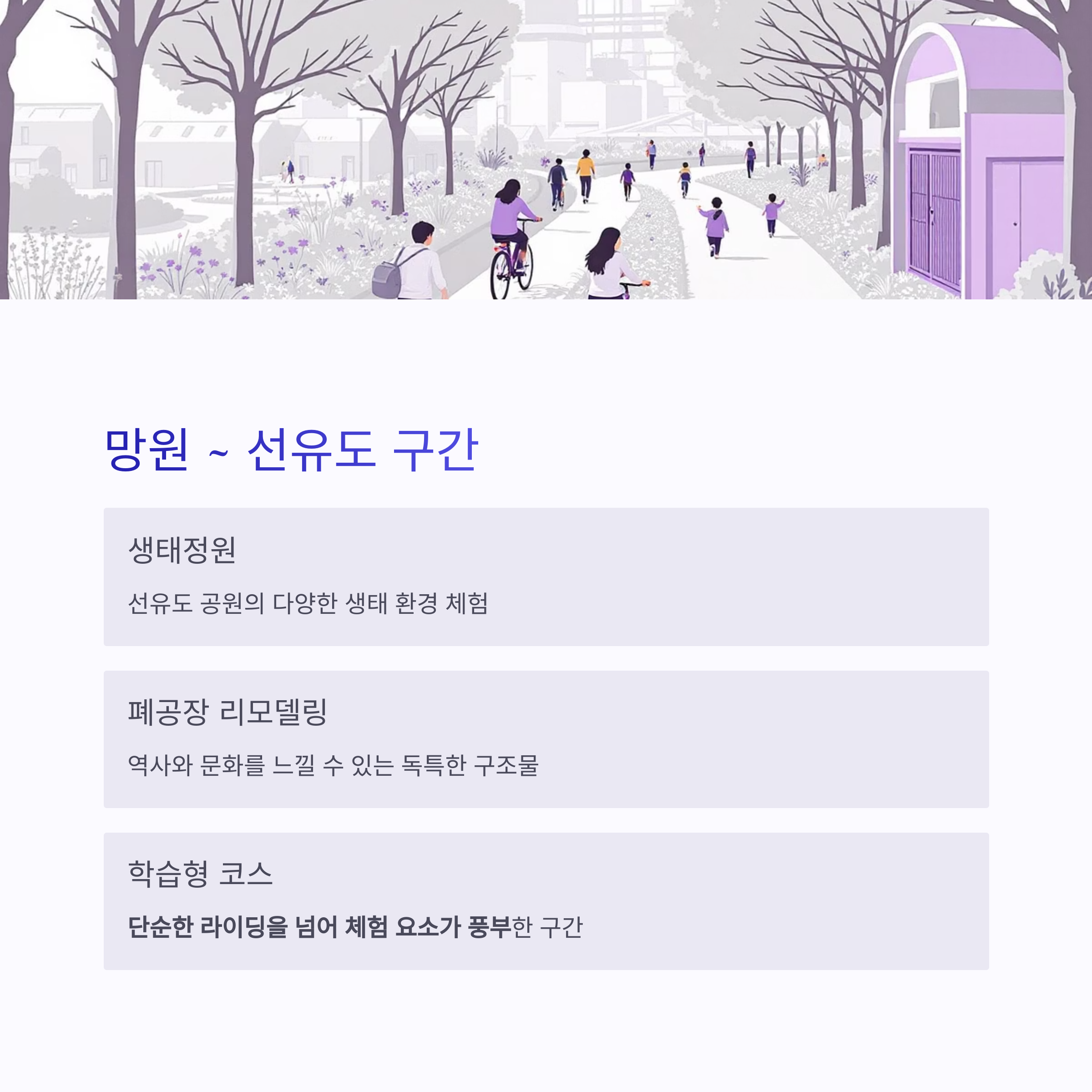 | 망원 ~ 선유도 | 생태 체험 요소 풍부 | 학습형 나들이 가족 |