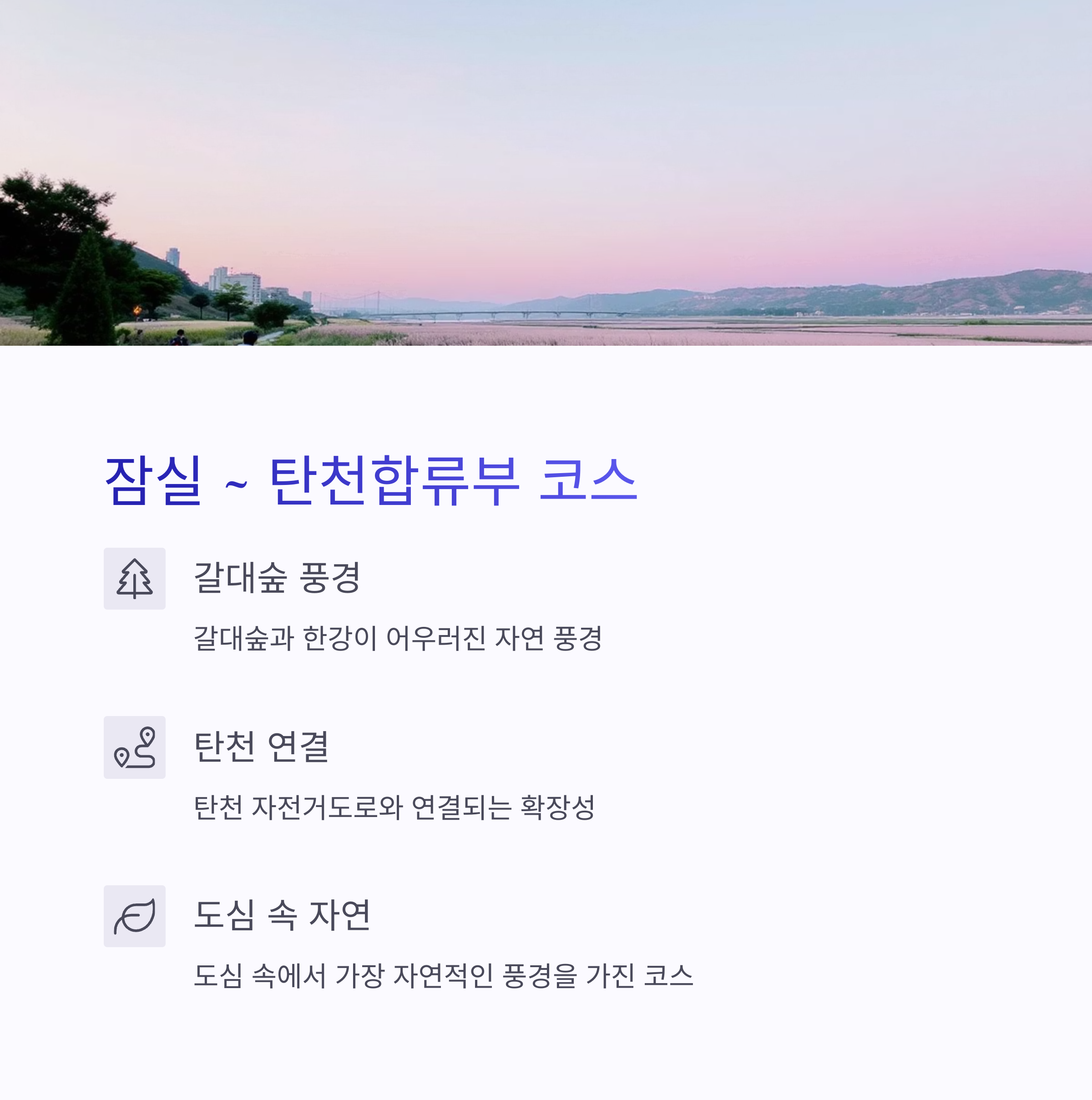 | 잠실 ~ 탄천 합류부 | 갈대숲, 강변 힐링 코스 | 자연 좋아하는 가족 |