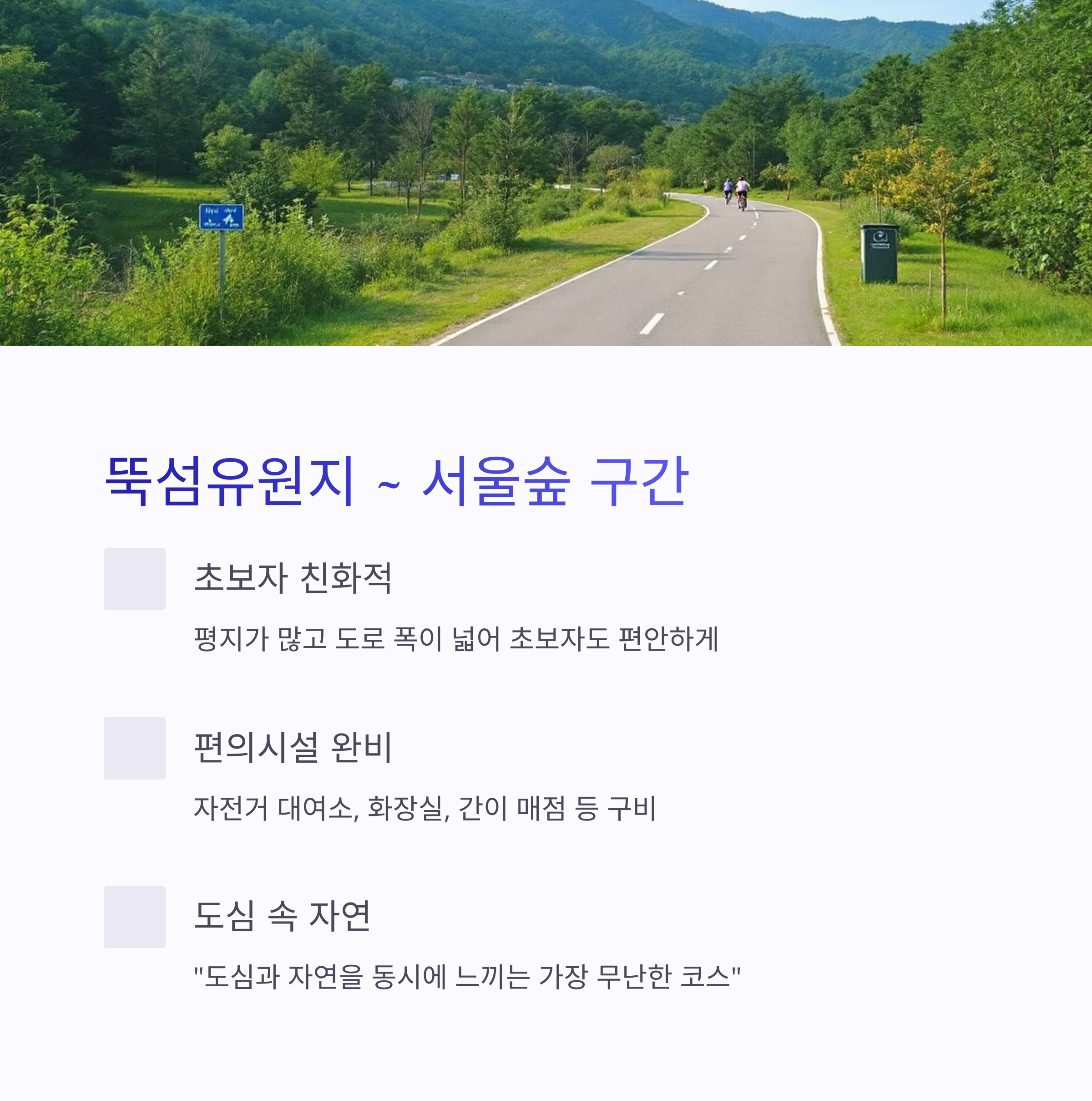 | 뚝섬 ~ 서울숲 | 평탄, 초보자 친화적 | 어린이, 자전거 초보 가족 |