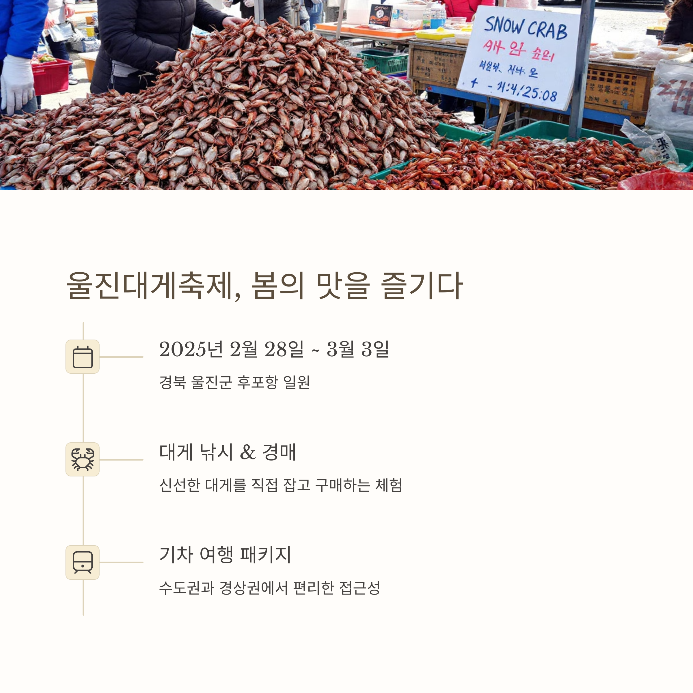 두 번째는 2월 28일부터 3월 3일까지 열리는 울진대게축제입니다. 겨울의 끝자락에서 맛보는 제철 대게는 그 자체로도 특별한 경험인데요, 축제 기간 동안 대게 시식뿐 아니라 낚시 체험, 경매, 요트 승선 체험 등 가족 단위, 커플 여행객 모두 즐길 수 있는 다양한 프로그램이 마련돼 있습니다. 기차 연계 패키지를 이용하면 수도권에서도 편하게 당일 또는 1박 여행이 가능해요.