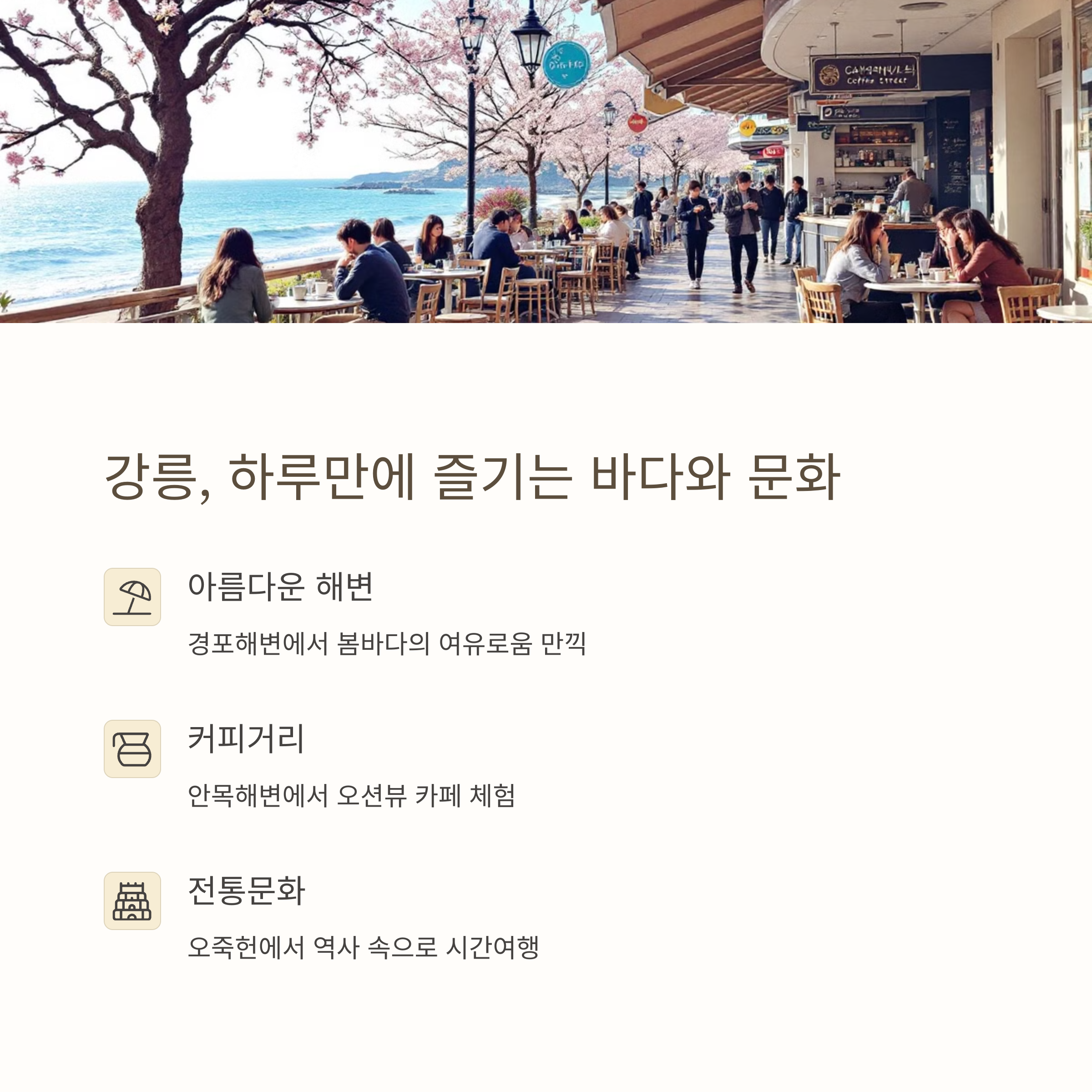 첫 번째 추천 코스는 강릉 당일치기 여행입니다. 동해안의 대표 여행지인 강릉은 아름다운 해변과 함께 문화적인 콘텐츠도 풍부해 하루 일정으로 다녀오기 딱 좋습니다. 아침에는 경포대에서 일출을 감상하고, 오죽헌을 둘러보며 역사와 고즈넉한 분위기를 느껴보세요. 오후엔 강릉 커피거리에서 향긋한 커피 한 잔과 함께 바다를 바라보며 여유로운 시간을 보내기 좋습니다.