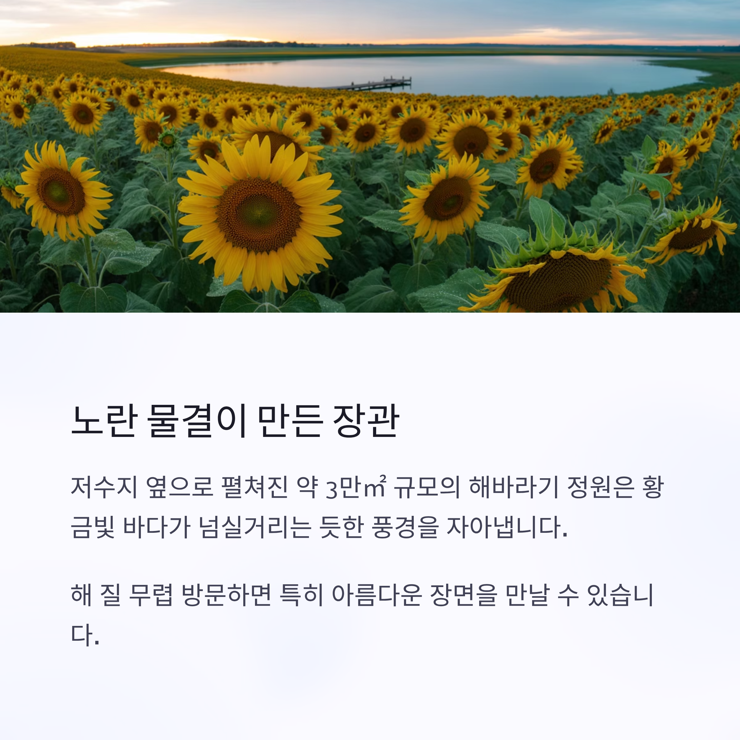 저수지 옆으로 펼쳐진 약 3만㎡ 규모의 해바라기 정원은 황금빛 바다가 넘실거리는 듯한 풍경을 자아냅니다. 바람에 흔들리는 꽃잎과 붉은 석양이 어우러지는 순간은 감동 그 자체이며, 해 질 무렵 방문하면 특히 아름다운 장면을 만날 수 있습니다.
