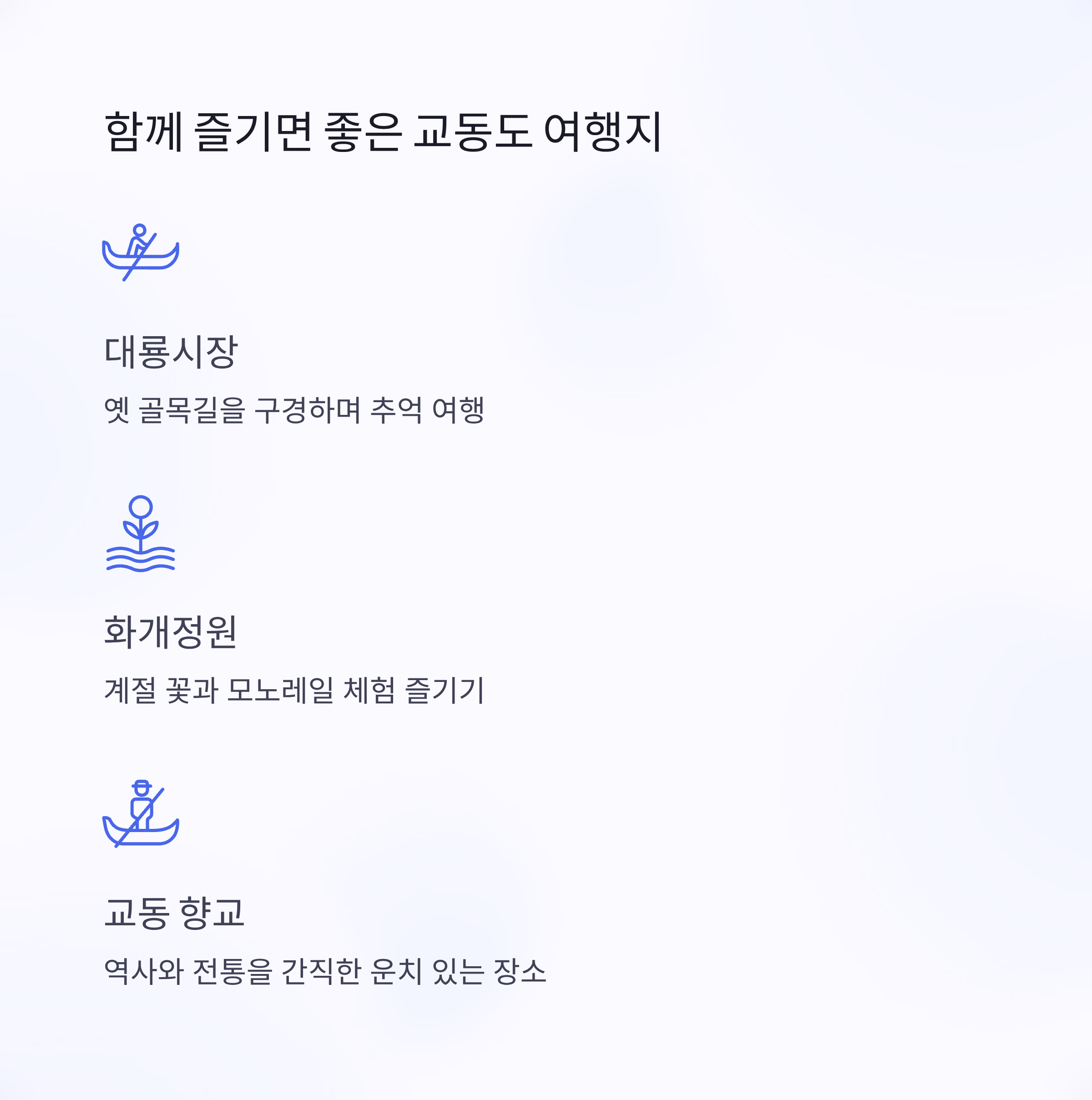 관람 후에는 대룡시장에 들러 옛 골목길을 구경하거나, 화개정원에서 계절 꽃과 모노레일 체험을 즐기는 것도 추천합니다. 역사와 전통을 간직한 교동 향교는 현재 공사 중이지만, 외부에서 바라보는 풍경만으로도 운치를 느낄 수 있습니다.