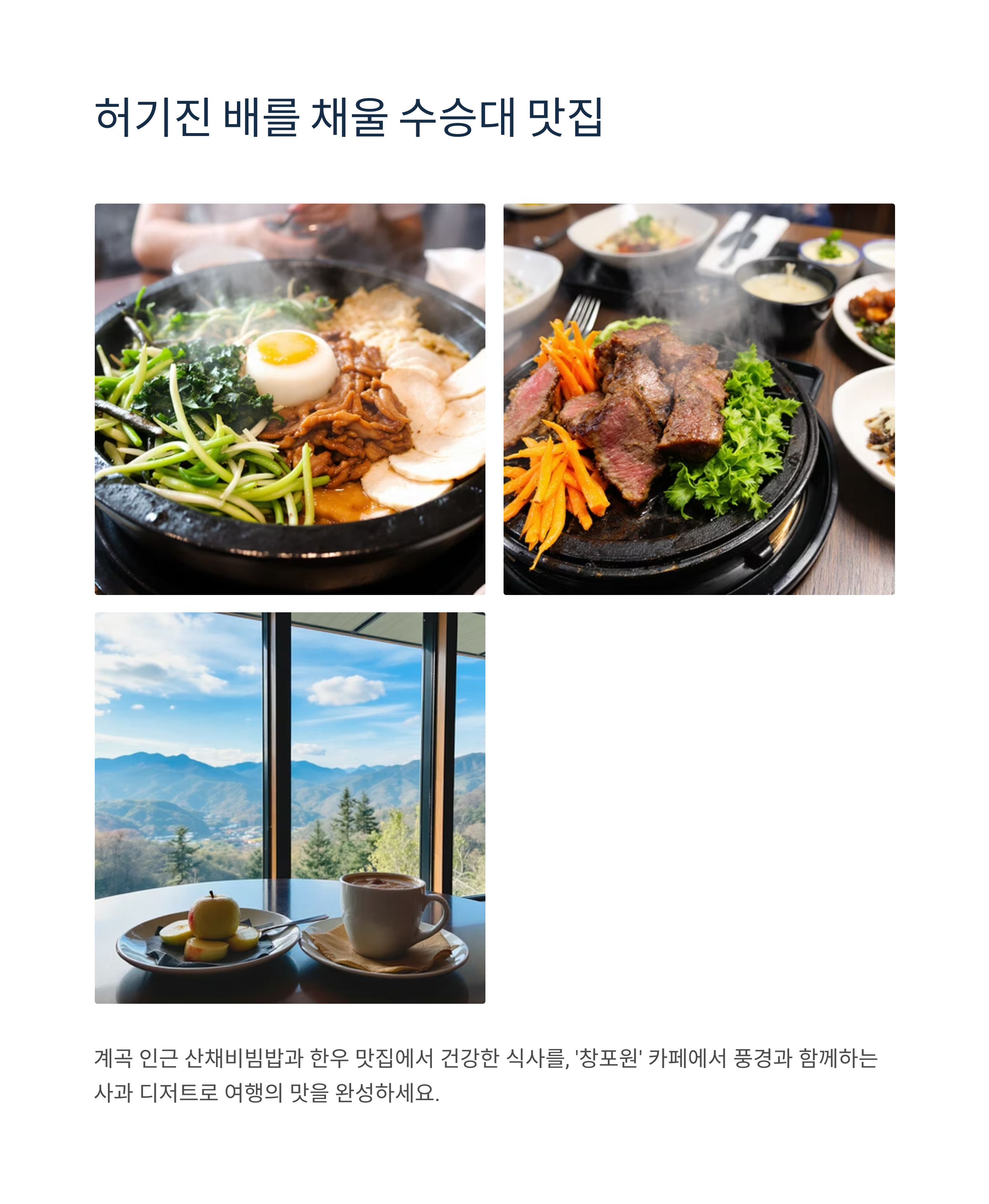 짧은 시간 안에 다양한 볼거리를 경험할 수 있어 1박 2일 코스로 딱 좋습니다.