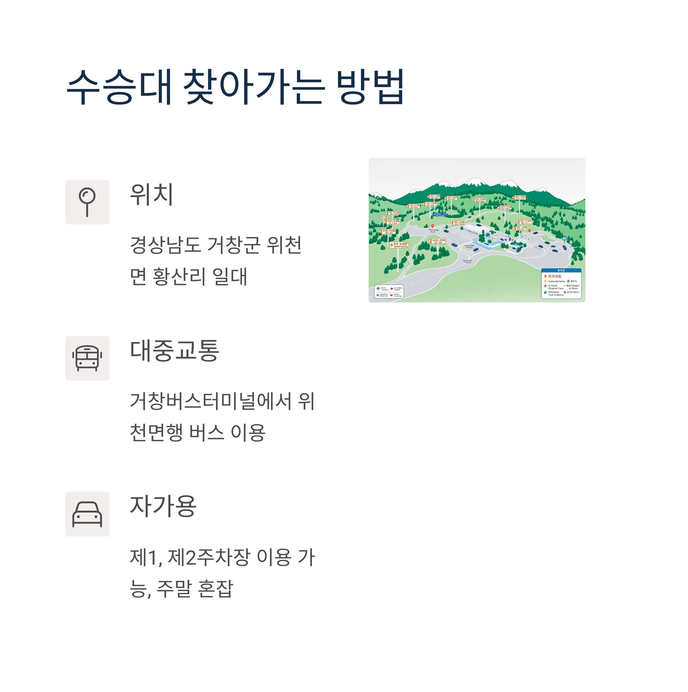대중교통은 거창버스터미널에서 수승대 방면 버스를 이용하면 됩니다.