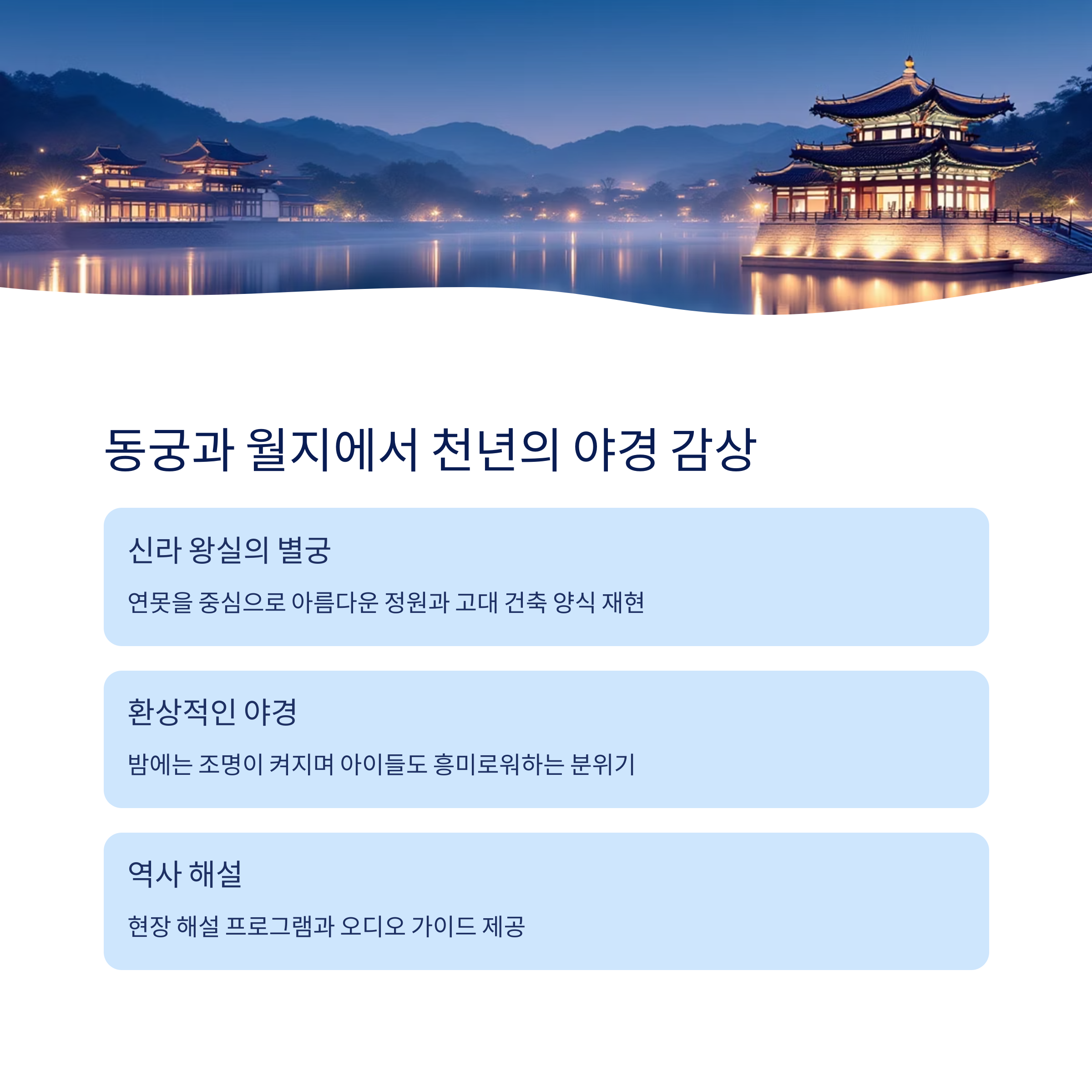 현장 해설 프로그램과 오디오 가이드를 통해 신라의 역사적 의미를 자연스럽게 전달할 수 있습니다
