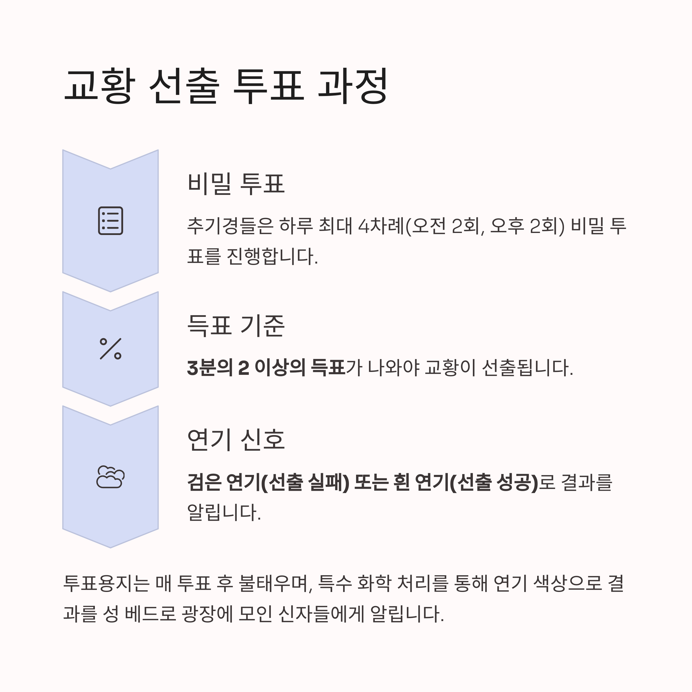 매 투표 후에는 투표용지를 불태우며, **특수 화학 처리를 통해 검은 연기(선출 실패) 또는 흰 연기(선출 성공)**를 피워