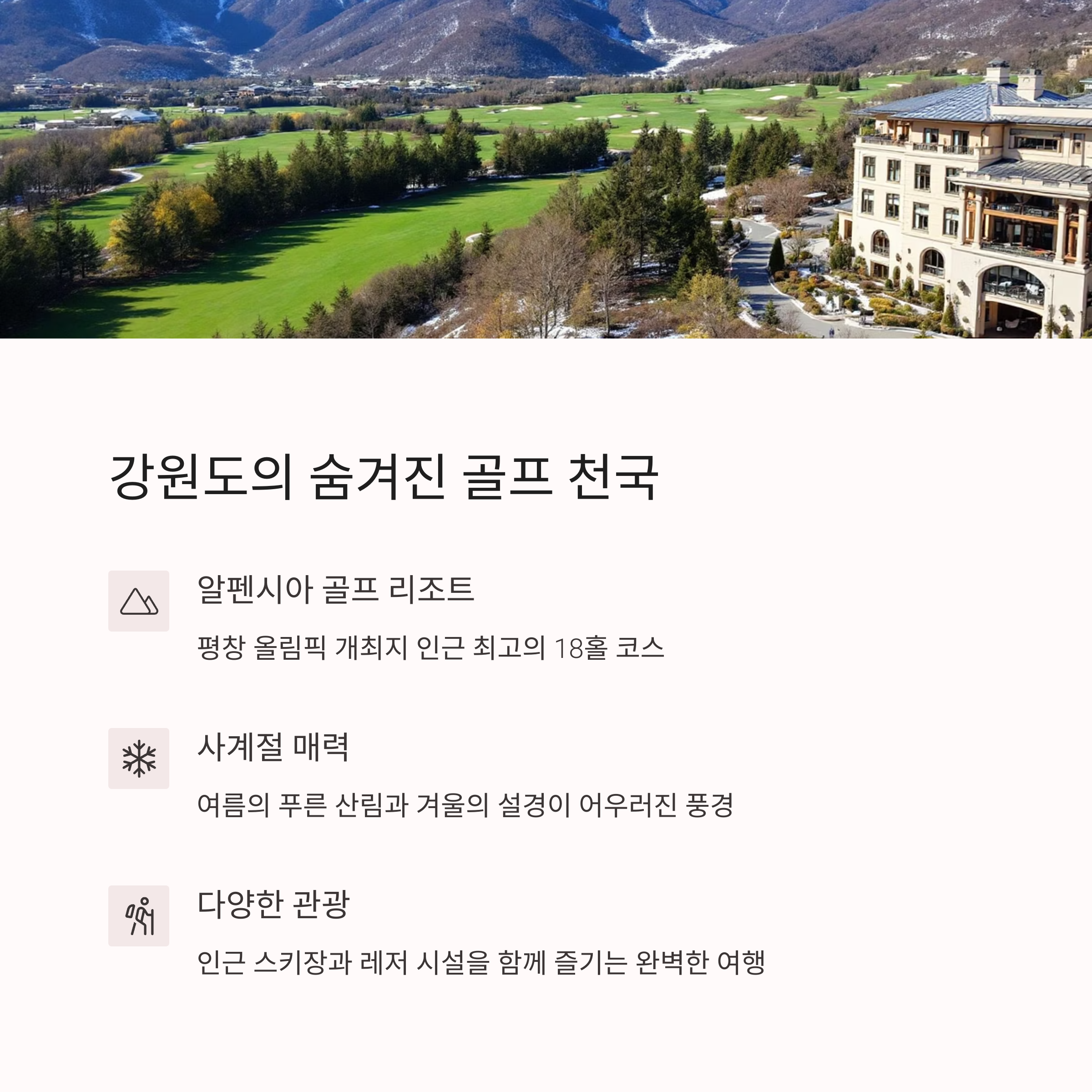강원도 골프 투어는 시원한 자연 속에서의 라운드로 유명합니다. 대표적으로 알펜시아 골프장과 파인리즈가 있으며, 청정한 고지대 코스에서의 플레이는 색다른 쾌감을 선사합니다. 여름철에도 시원한 기온 덕분에 쾌적하게 라운딩이 가능하며, 설악산, 오색약수, 속초 바다 등과 연계된 관광 코스도 함께 즐길 수 있어 골프 외 즐거움도 풍성합니다. 숙박은 리조트형 또는 호텔형 중 선택할 수 있고 가족 동반 여행객에게도 인기가 높습니다.