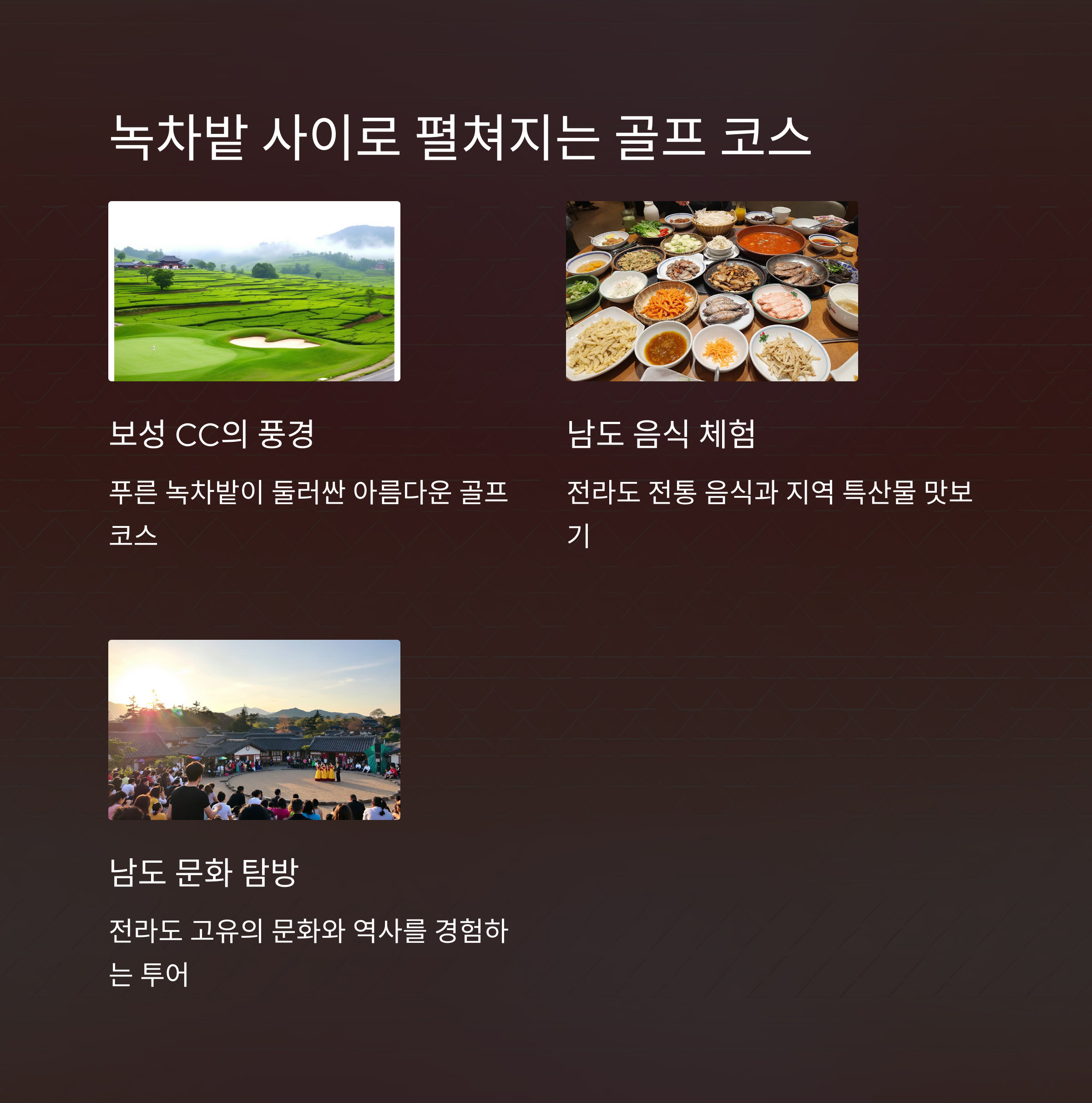 | 알펜시아, 파인리즈 등 고지대 명문 골프장 | 보성CC, 녹차밭 관광 포함된 체류형 상품 | 오션비치, 여수 경도리조트 해양 테마 연계 |