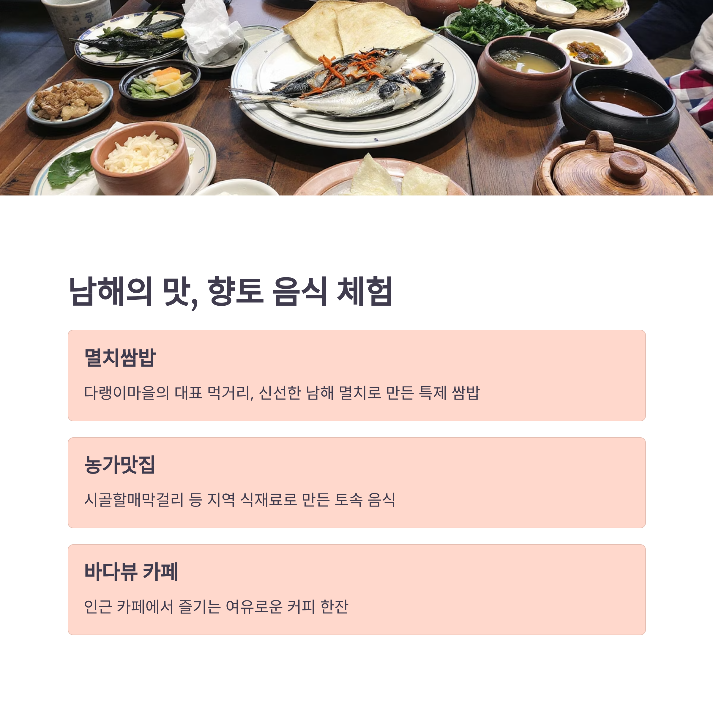 멸치쌈밥, 해물파전, 제철 해산물 요리는 다랭이마을 소풍의 필수 코스입니다.
