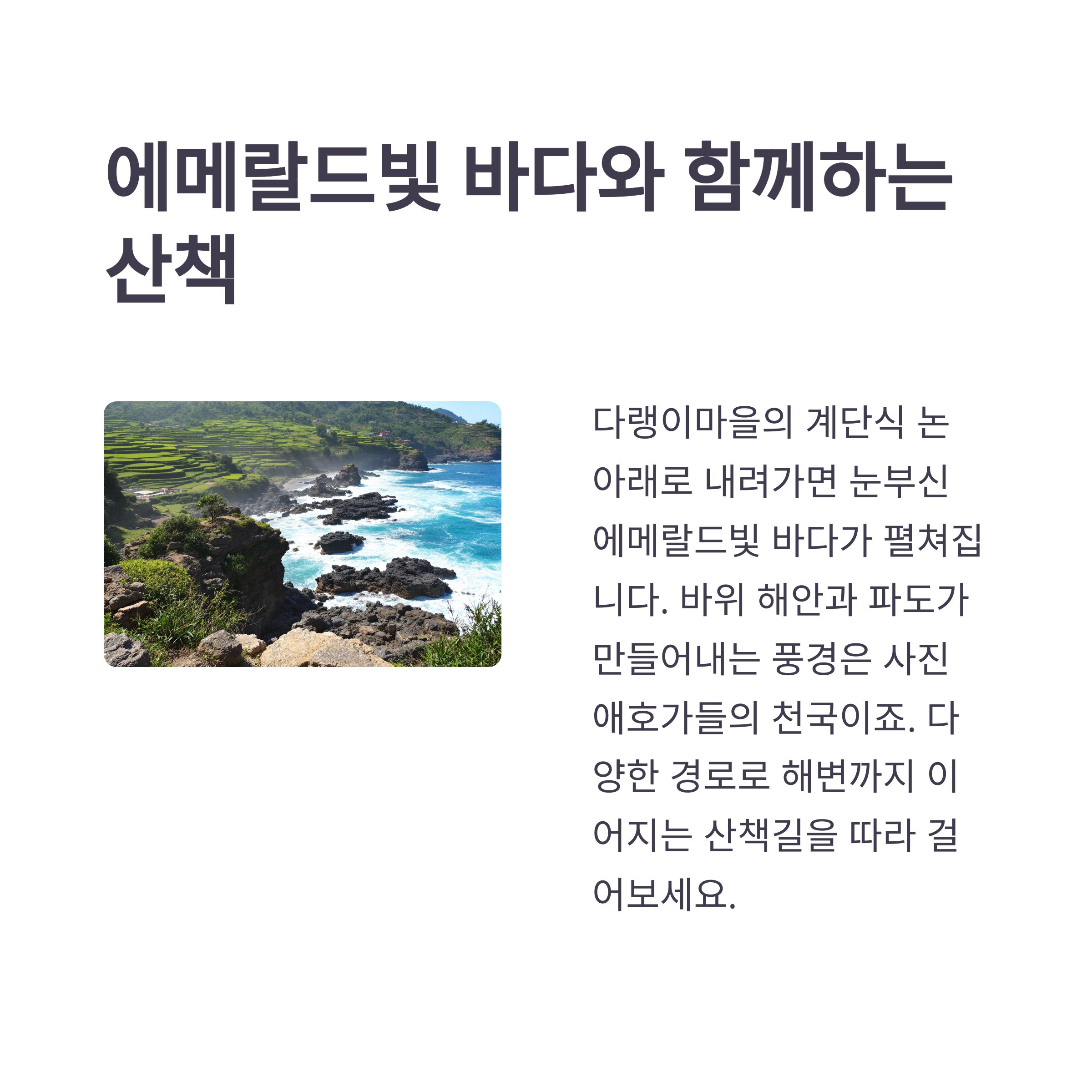 계단식 논, 푸른 바다, 그리고 따뜻한 사람들의 미소가 오래도록 기억에 남을 것입니다.