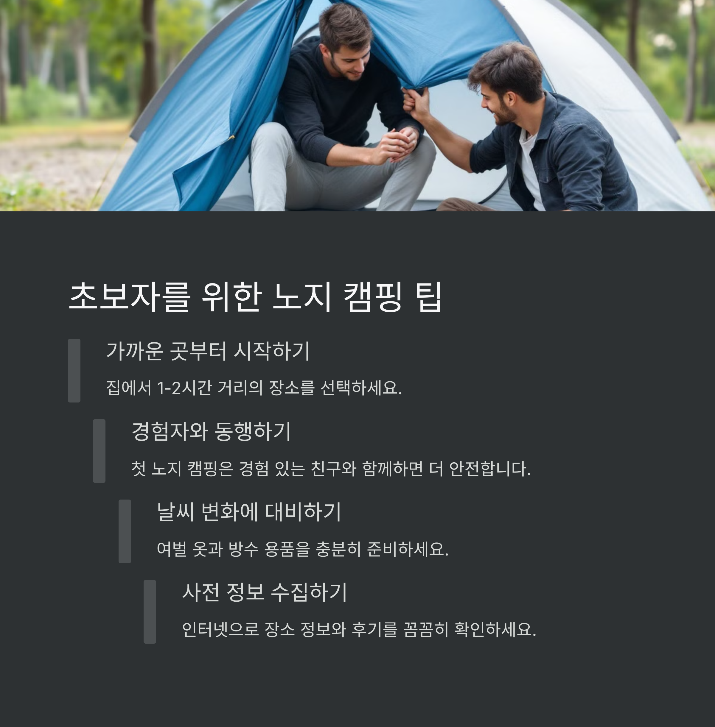 노지 캠핑은 도시의 소음을 벗어나 자연 속에서 진정한 쉼을 찾는 최고의 힐링 여행입니다. 자연을 존중하며, 조용하고 청결하게 캠핑을 즐겨보세요. 여러분이 추천하는 노지 캠핑 명소도 댓글로 알려주세요!