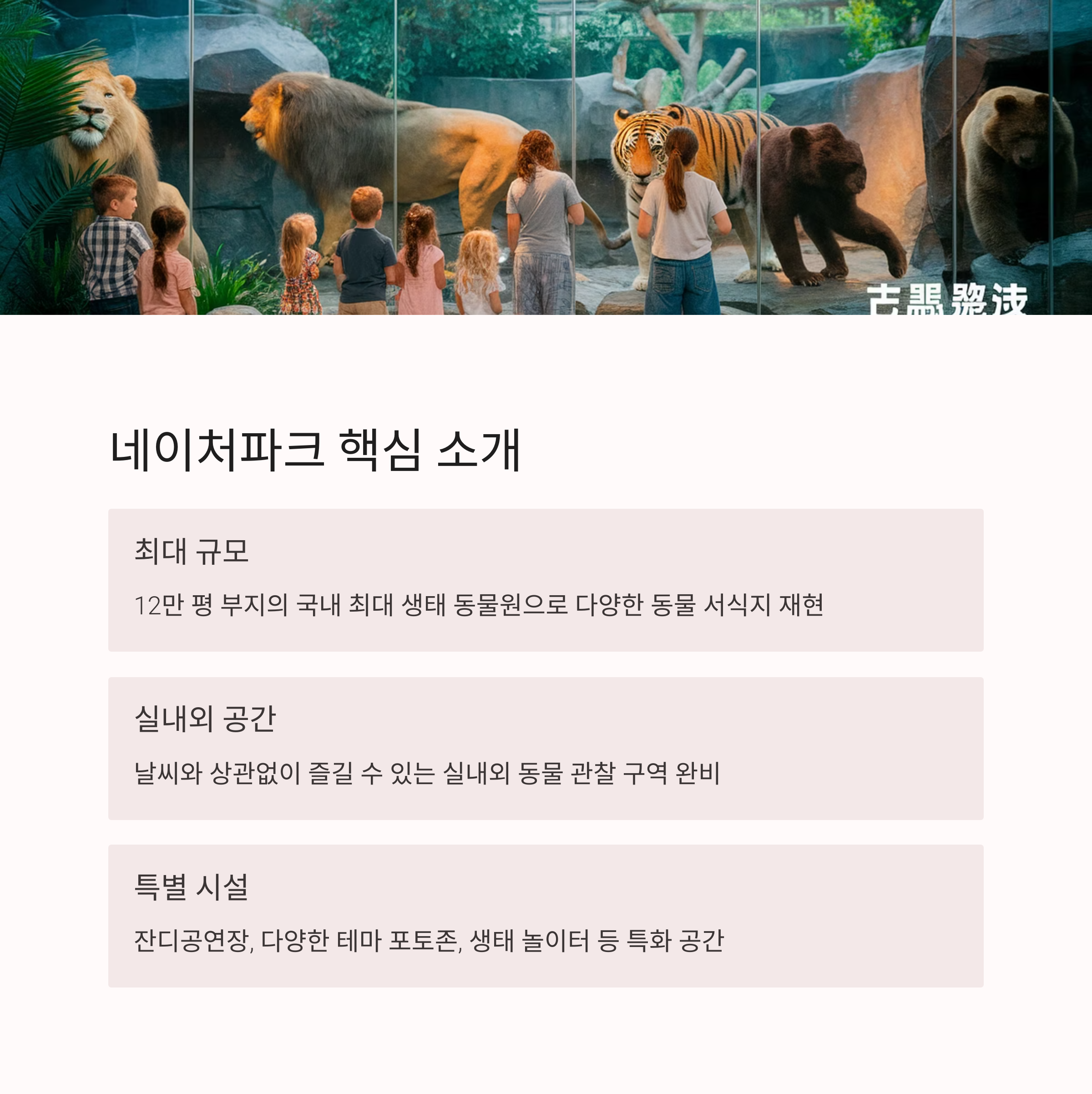 네이처파크의 가장 큰 장점은 실내외 공간의 조화입니다. 실내에는 기후나 날씨에 관계없이 관람이 가능한 동물관이 있고, 실외에는 잔디공연장과 다양한 테마로 꾸며진 포토존이 마련되어 있어 사계절 내내 활용이 가능합니다. 계절마다 테마가 바뀌는 만큼, 같은 장소라도 매번 새로운 느낌을 받을 수 있으며, 다양한 동물들과의 교감은 아이들의 정서 발달에도 긍정적인 영향을 미친다는 점에서 교육적인 가치 또한 높습니다.
