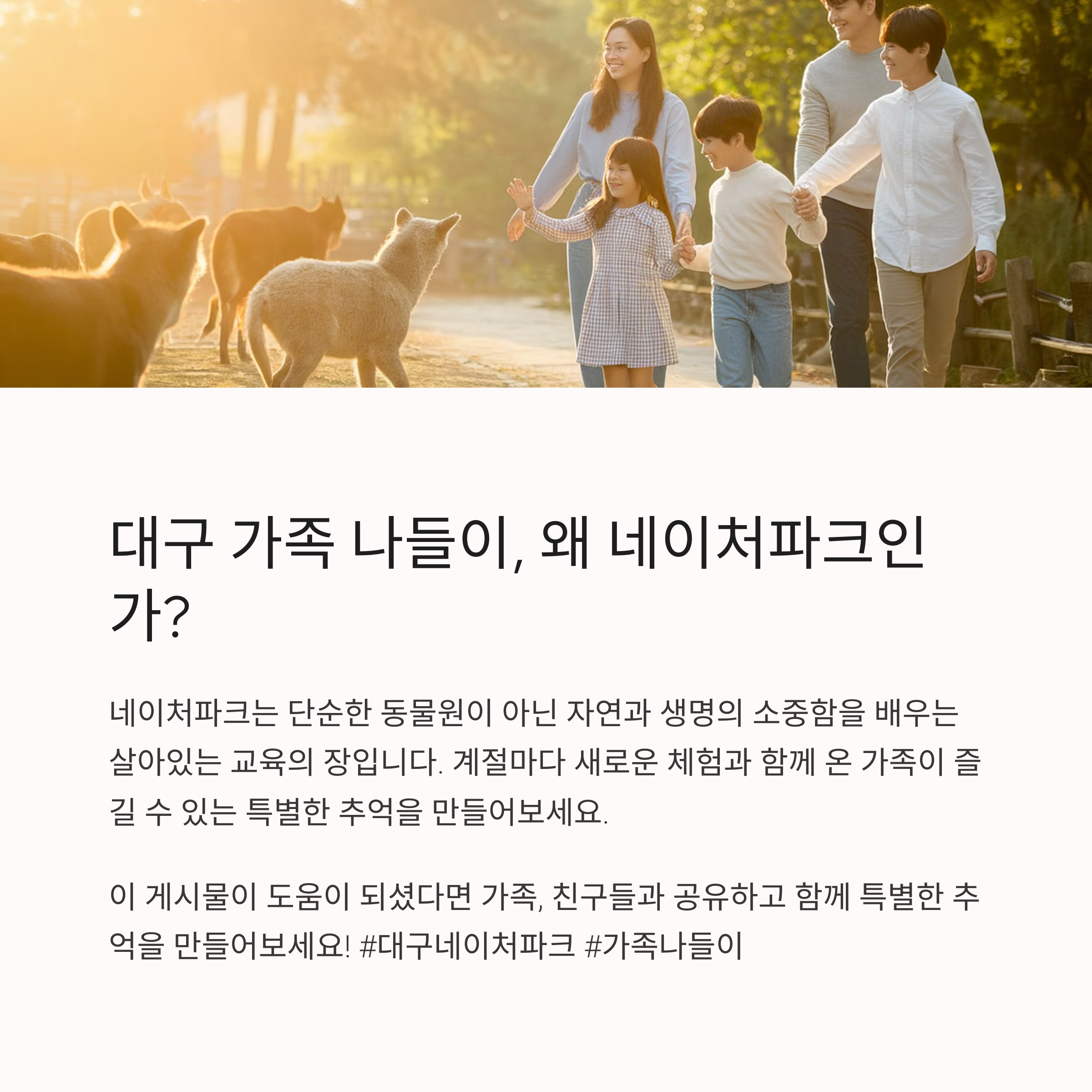 따뜻한 봄날, 사랑하는 가족과 함께 떠나는 나들이는 단순한 외출을 넘어 삶의 활력이 됩니다. 네이처파크는 자연, 동물, 체험, 그리고 휴식이 조화롭게 어우러진 특별한 공간으로, 누구에게나 소중한 하루를 선물해줍니다. 다양한 볼거리와 체험이 풍성하여 아이들은 물론 어른들에게도 만족스러운 시간을 안겨줄 수 있습니다. 이번 주말에는 차 한 대로 가볍게 떠날 수 있는 대구 근교의 네이처파크에서 가족과 함께 웃음 가득한 하루를 보내보세요.