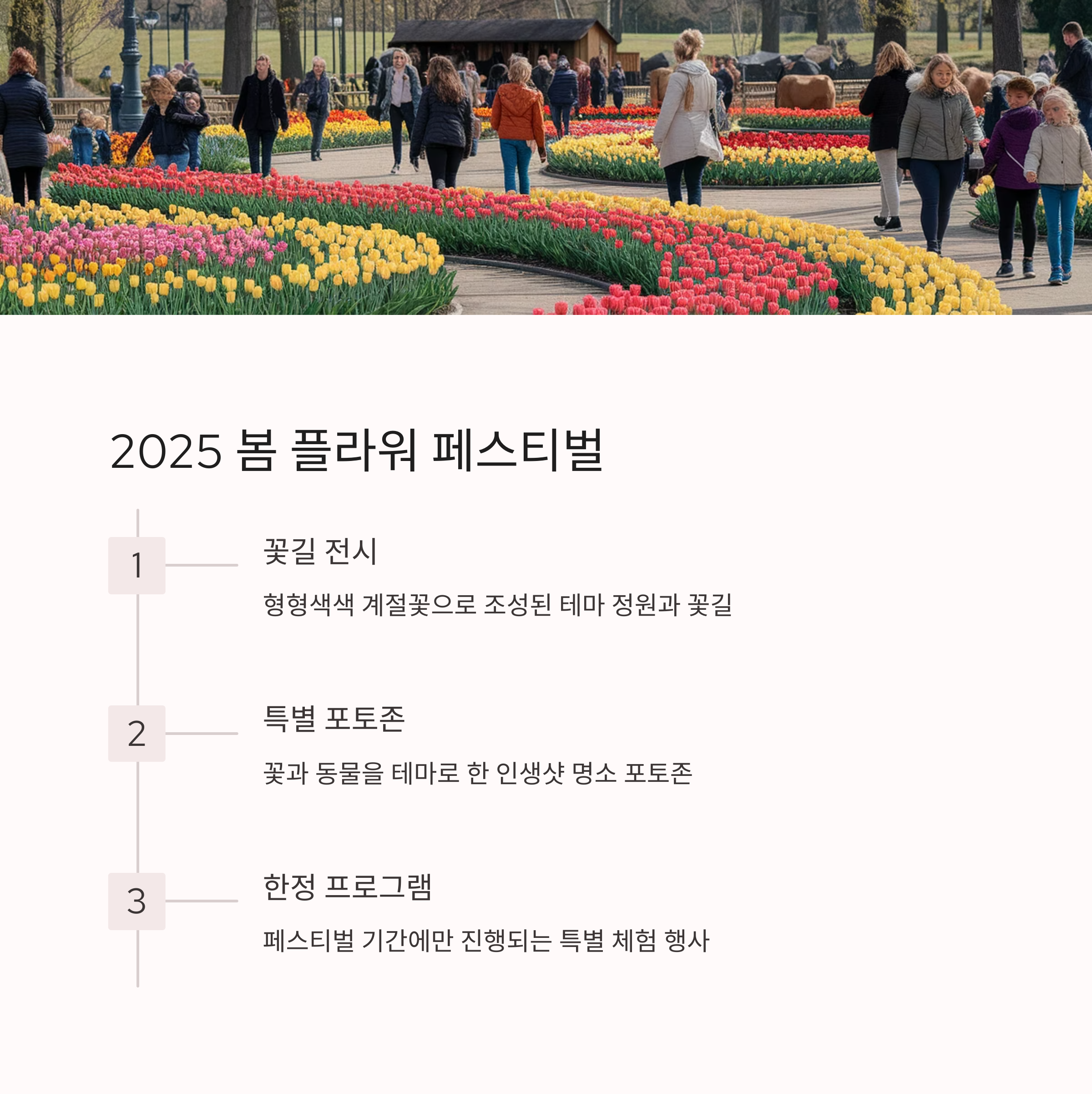 특히나 봄 시즌에는 플라워 페스티벌이 열려 향기로운 꽃들로 가득한 공간에서 각종 공연과 체험을 경험할 수 있습니다. 실내외 동물원, 포토존, 잔디공연장까지 다양하게 구성되어 있어 가족 단위 나들이에 최적화되어 있습니다.