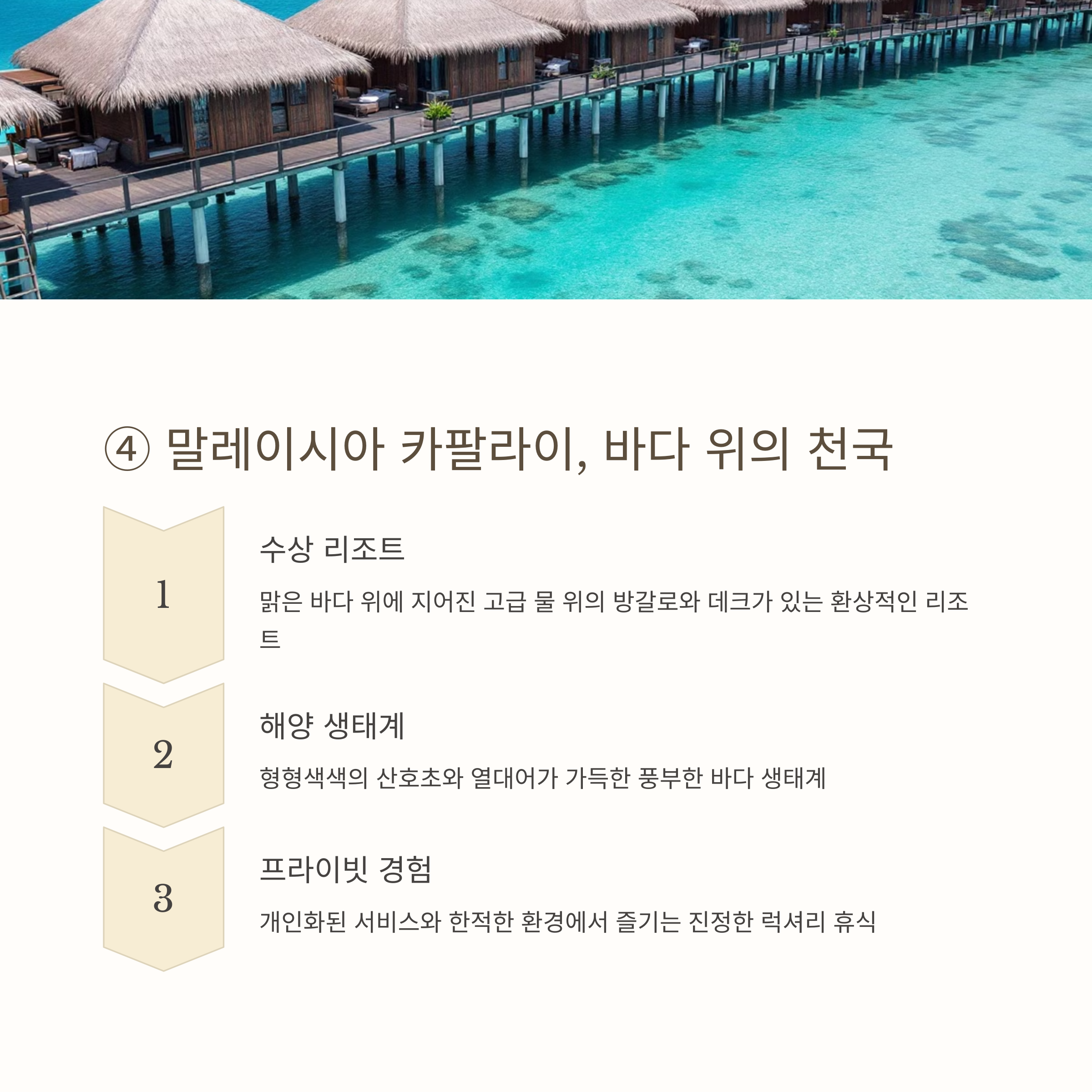 1. 라오스 씨판돈 – 메콩강의 4천 개 섬에서 여유로운 시간 2. 베트남 꽝빈 – 세계에서 가장 큰 동굴이 있는 신비로운 지역 3. 태국 꼬꾸드 – 관광객이 적고 자연이 보존된 조용한 섬 4. 말레이시아 카팔라이 – 바다 위 리조트에서 즐기는 환상적인 휴식 5. 캄보디아 코콩 – 정글과 강이 어우러진 아름다운 에코 여행지