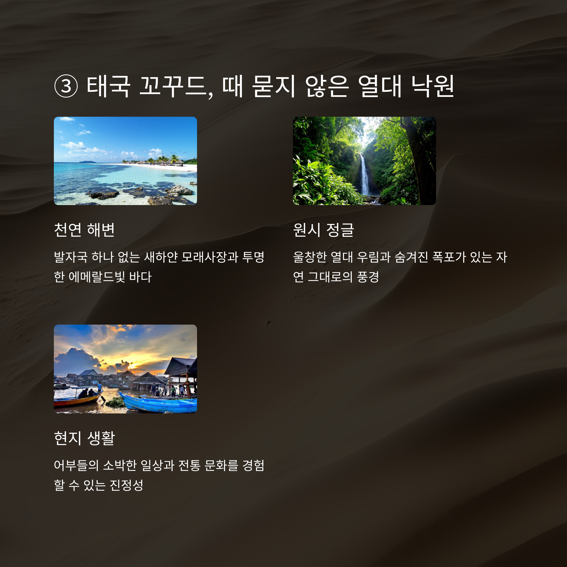 | 한적한 여행지의 매력 | 관광객이 적고 자연 속에서 여유롭게 힐링 가능 |