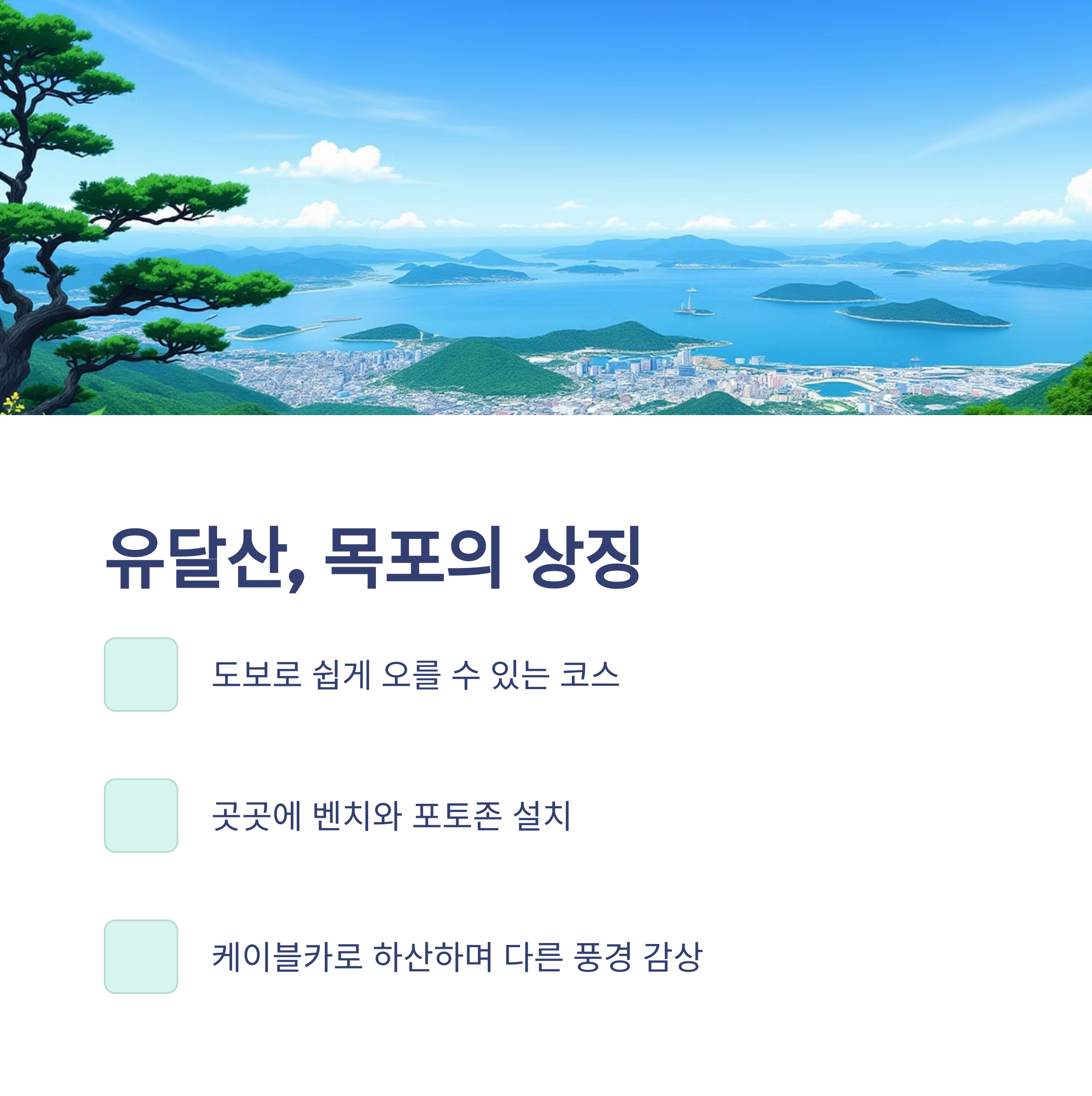 유달산은 목포의 대표적인 명소로, 도보로 올라가기 좋은 코스입니다.
