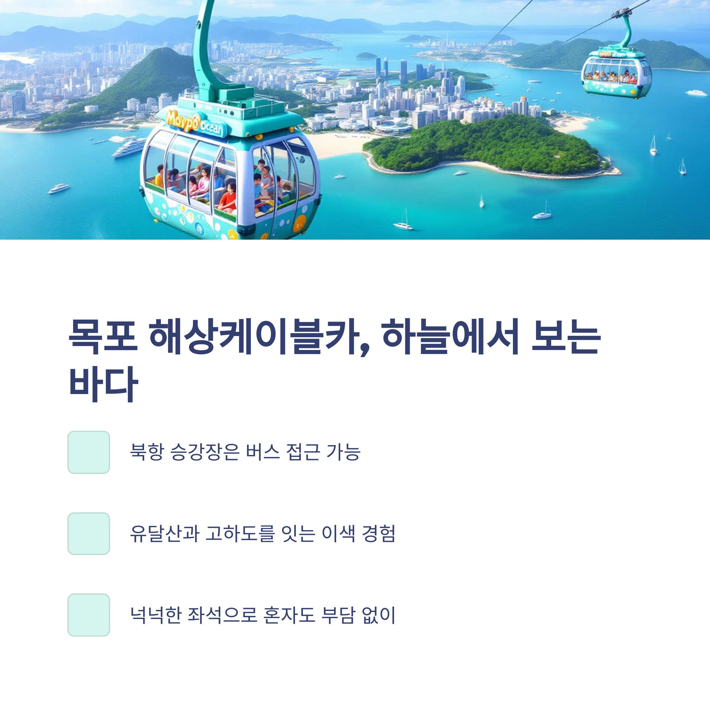 | 해상케이블카 | 도보/버스 | 바다 위 이색 체험 |