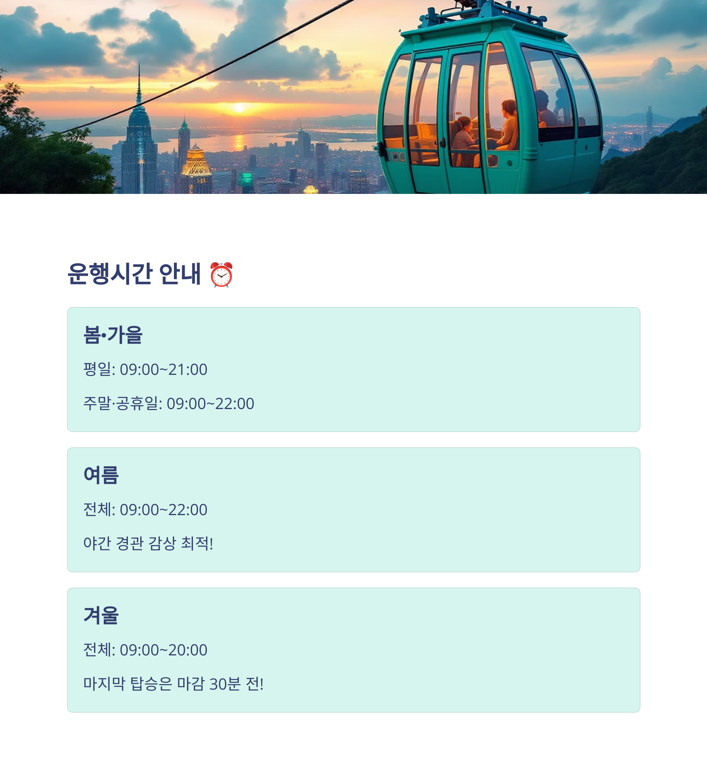 봄·가을 평일은 오전 9시부터 오후 9시까지, 주말과 공휴일은 오후 10시까지 연장 운행됩니다. 여름철에는 야간까지 운영하여 오후 10시까지 가능하며, 겨울철에는 해가 빨리 지기 때문에 오후 8시 정도에 마감합니다. 마지막 탑승 시간은 마감 30분 전이니 늦지 않게 도착하시길 바랍니다.
