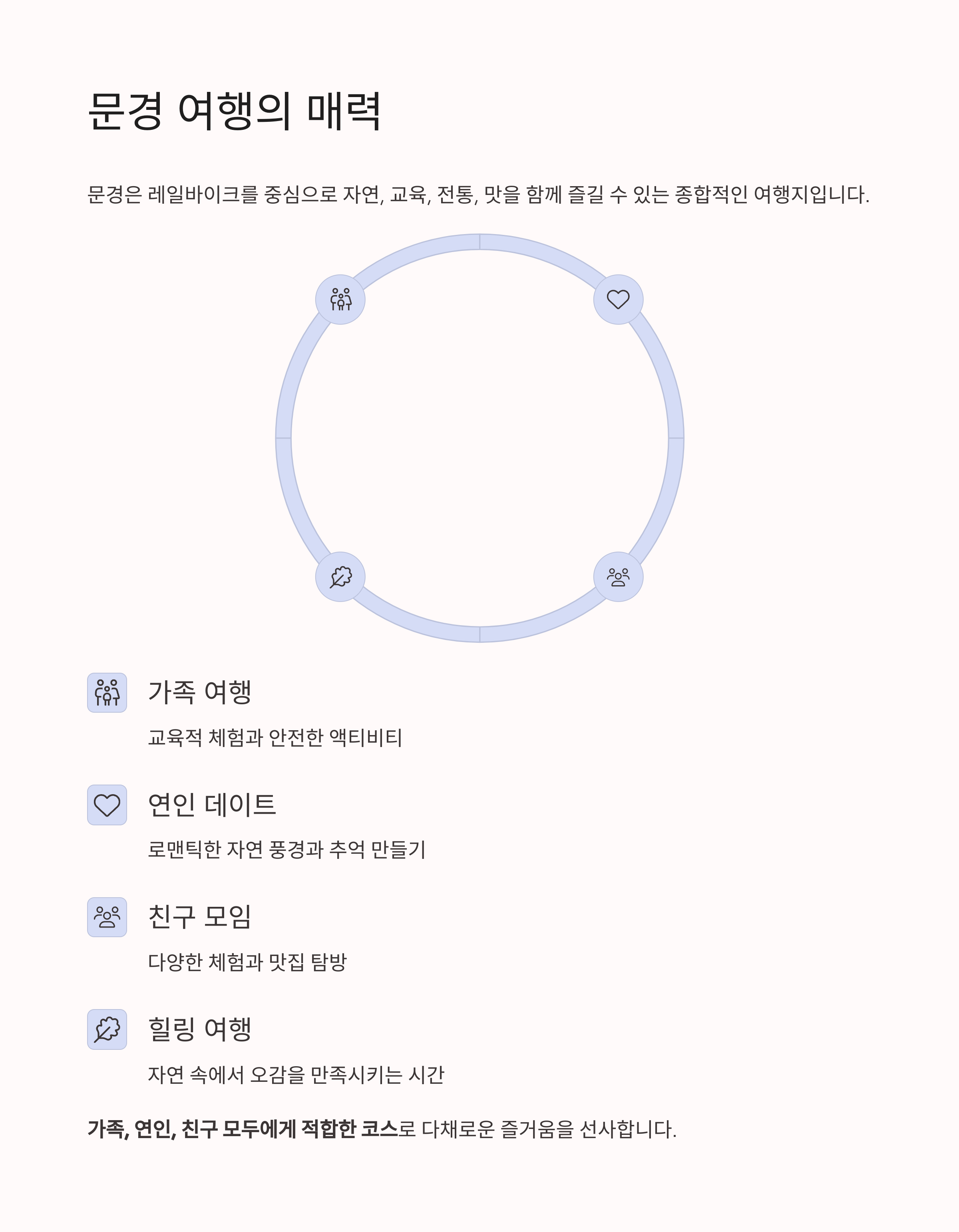 가족, 연인, 친구 모두에게 적합한 코스를 구성할 수 있는 곳으로