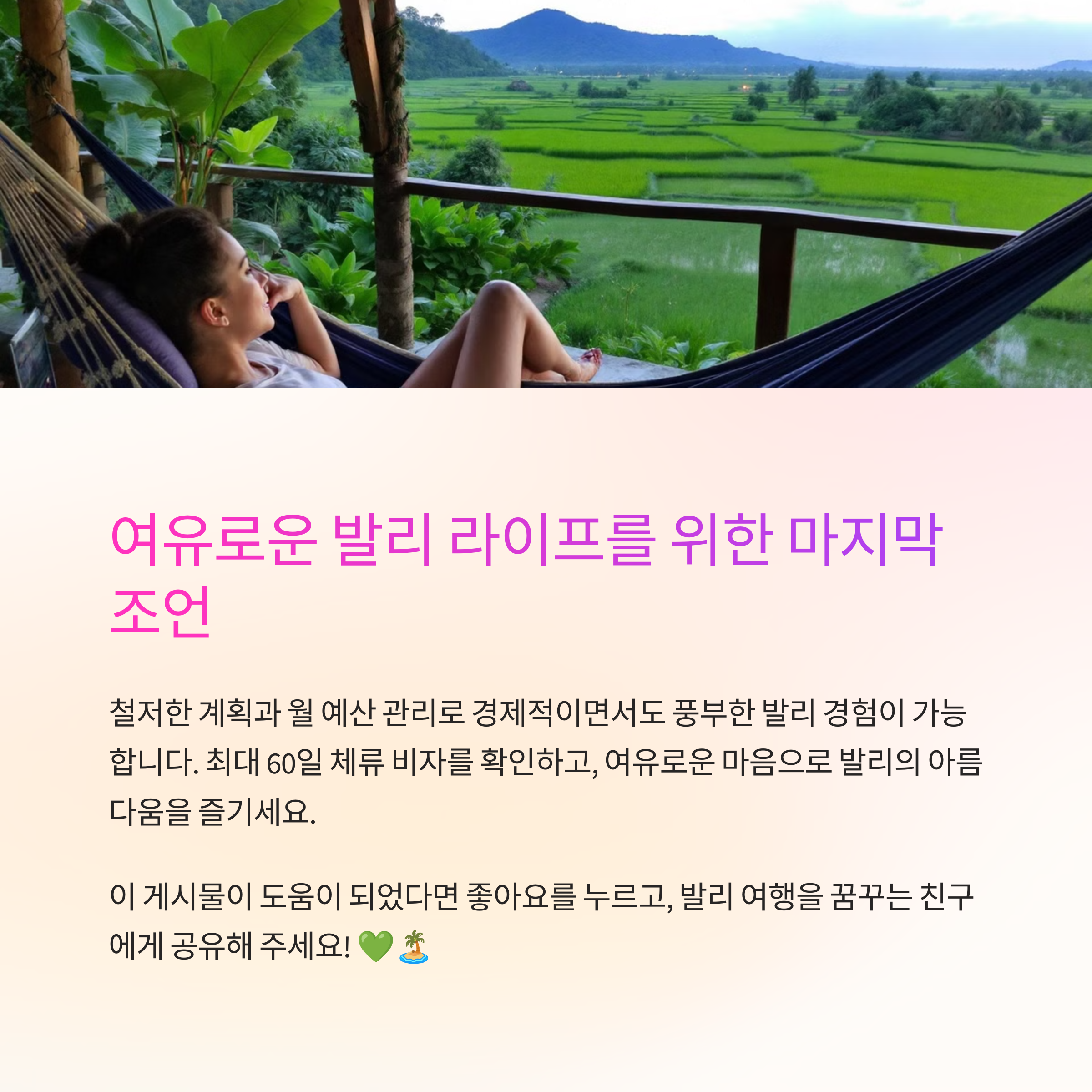발리에서 한 달 살기는 저렴한 숙소와 다양한 생활 꿀팁 덕분에 경제적이고 풍요로운 경험을 제공합니다. 준비를 철저히 한다면 발리의 아름다운 자연과 여유로운 라이프스타일을 만끽할 수 있습니다. 여러분도 발리 한달 살기에 도전해 보시고, 그 경험을 댓글로 공유해 주세요!