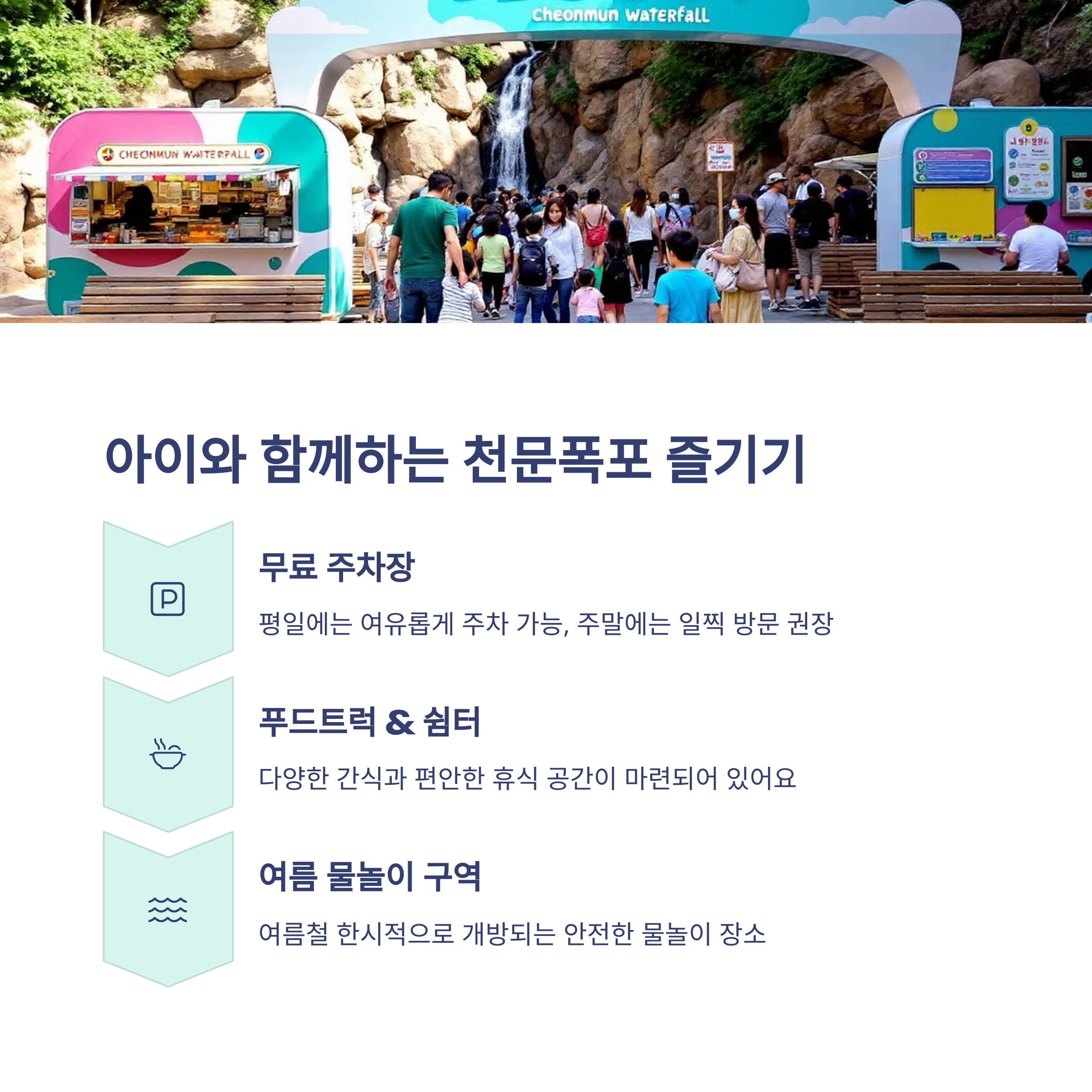 천문폭포 입구에는 간이 쉼터, 푸드트럭, 매표소 등이 마련되어 있으며