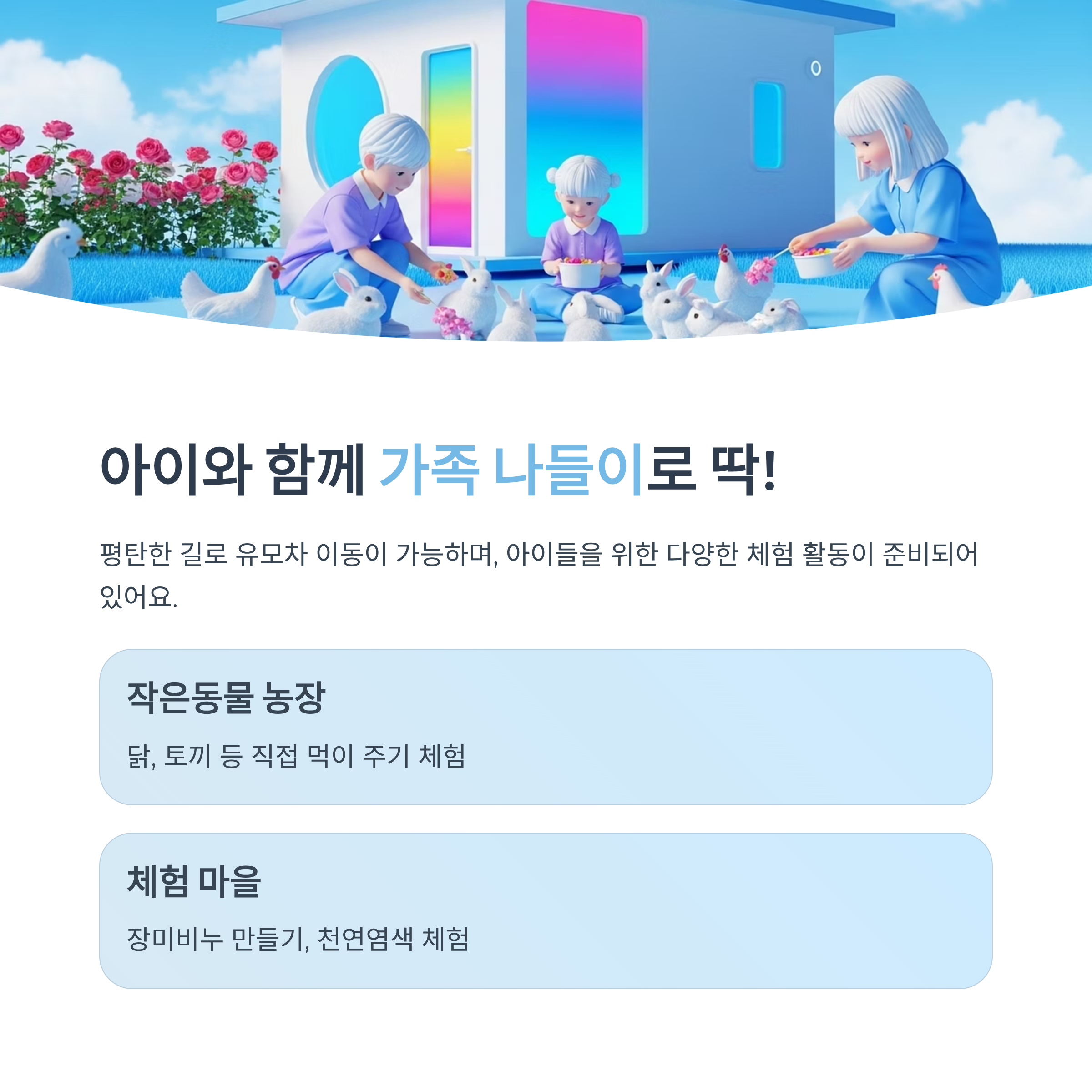 | 작은동물 농장 | 닭, 토끼 등 직접 먹이 주기 가능 |