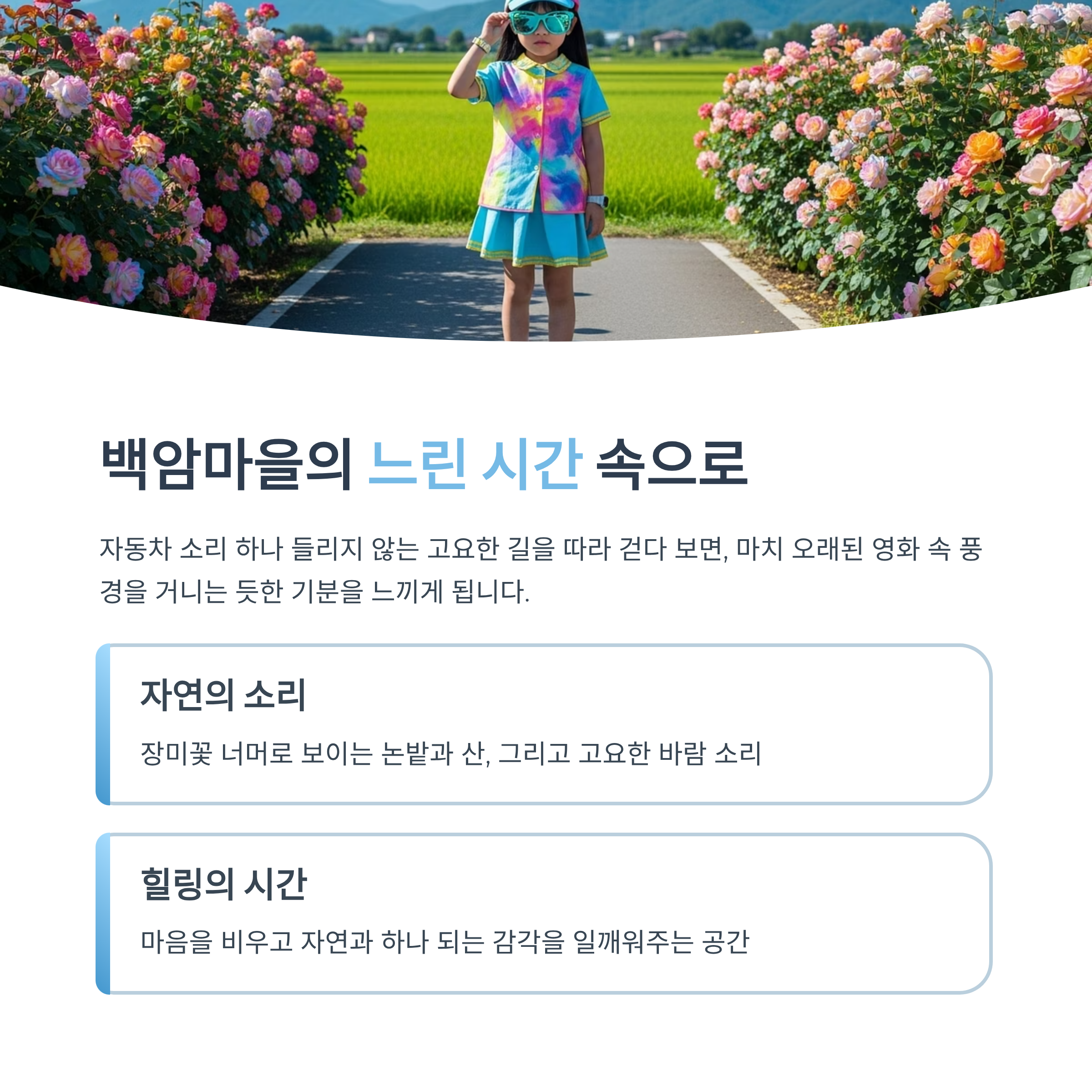 특히 추천드릴 만한 힐링 코스입니다. 이번 글에서는 백암마을 장미길의