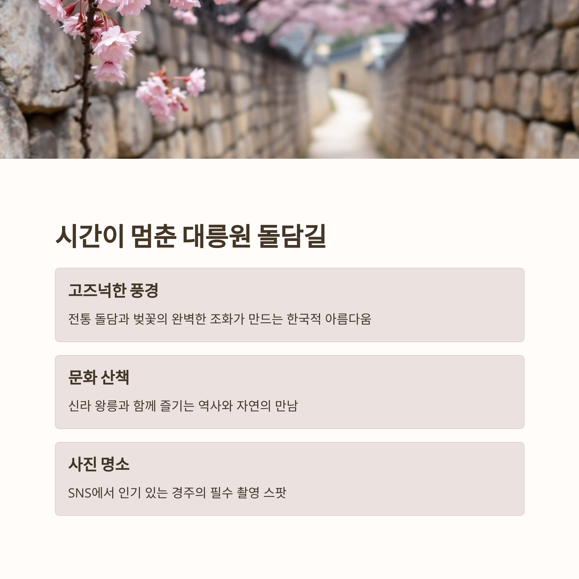 | 대릉원 돌담길 | 전통 담장과 조용한 벚꽃 산책 코스 |