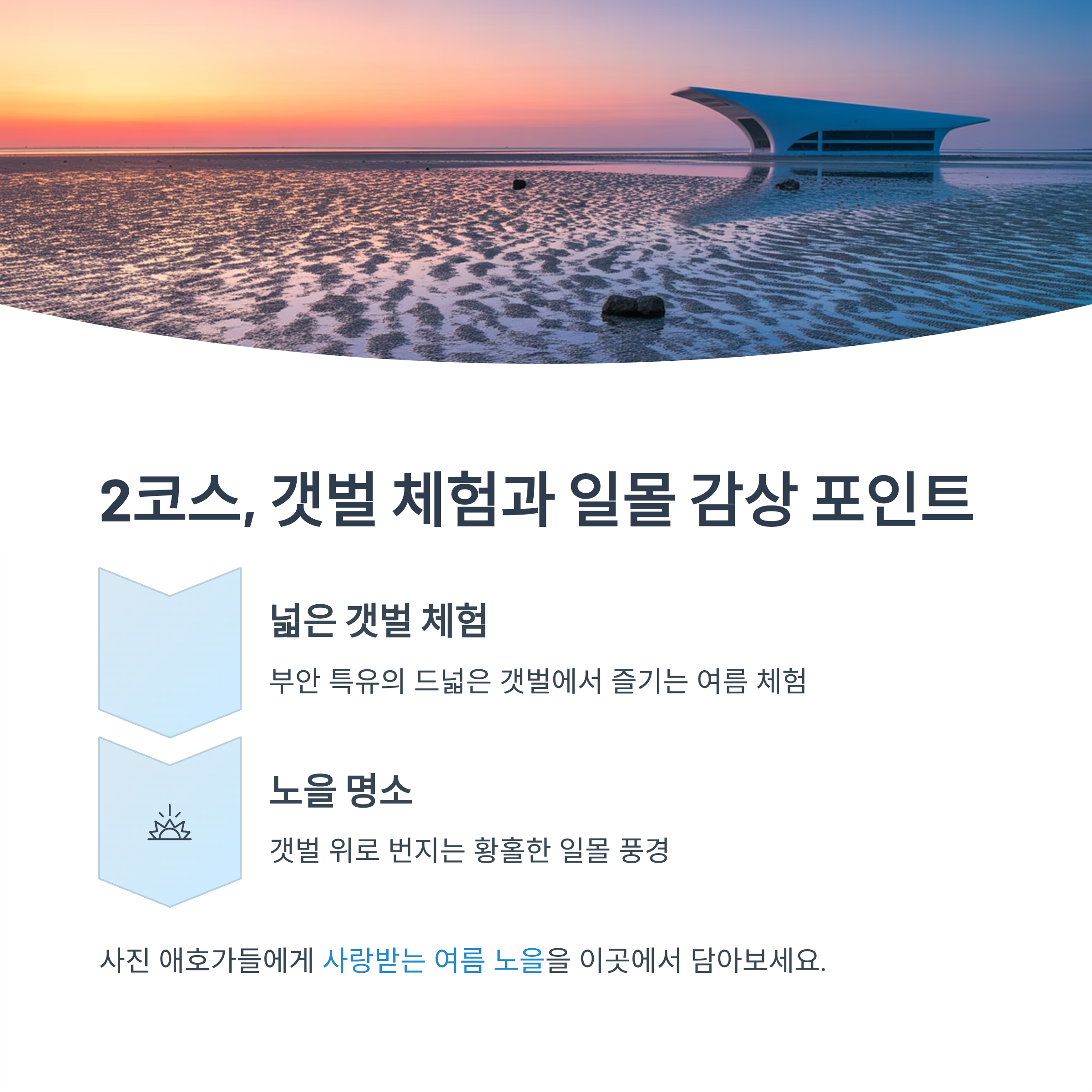 2코스에서는 부안 특유의 넓은 갯벌이 펼쳐져 있어 여름철 갯벌 체험에