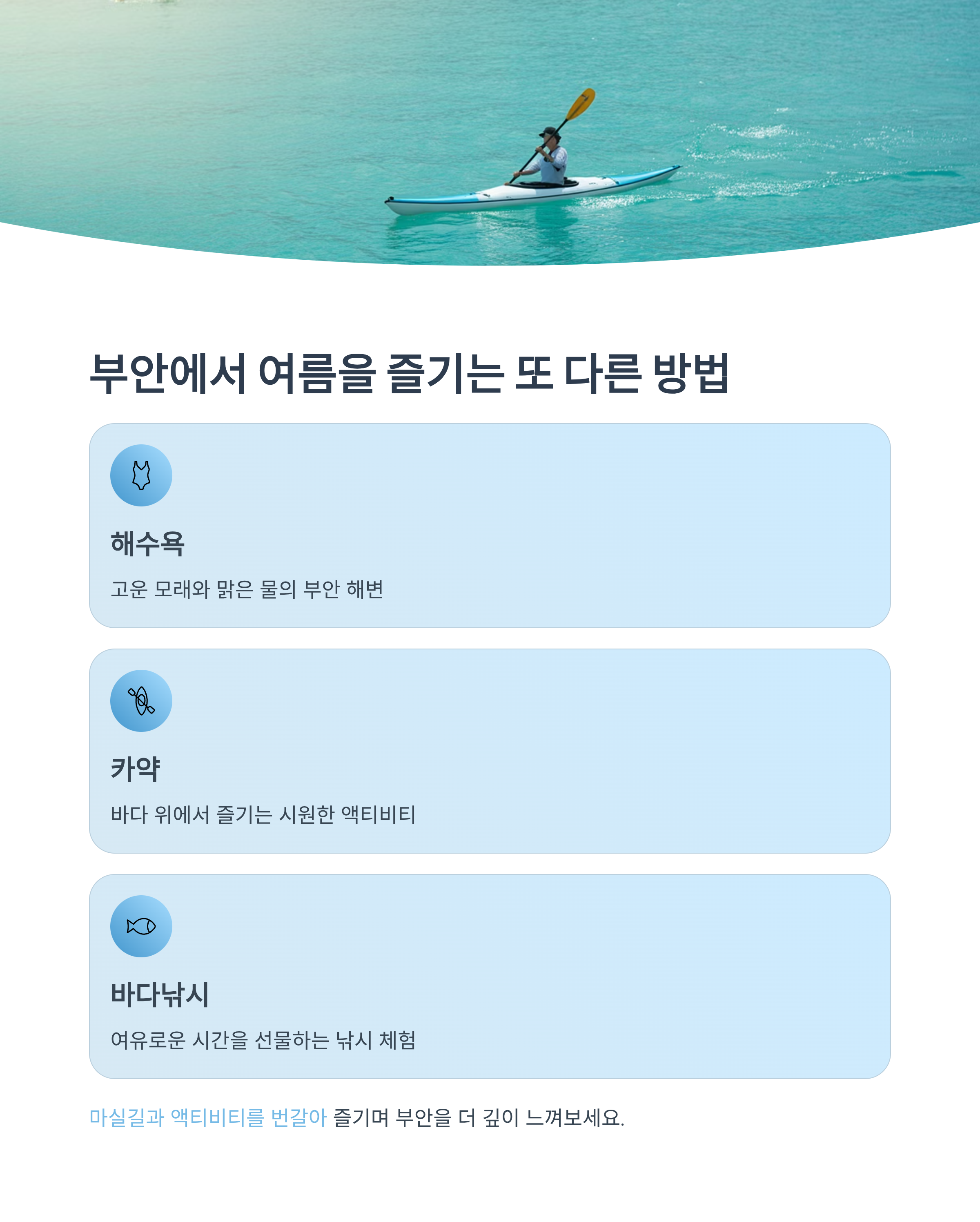도보 여행 외에도 부안에서는 해수욕, 카약, 바다낚시 등 다양한 여름