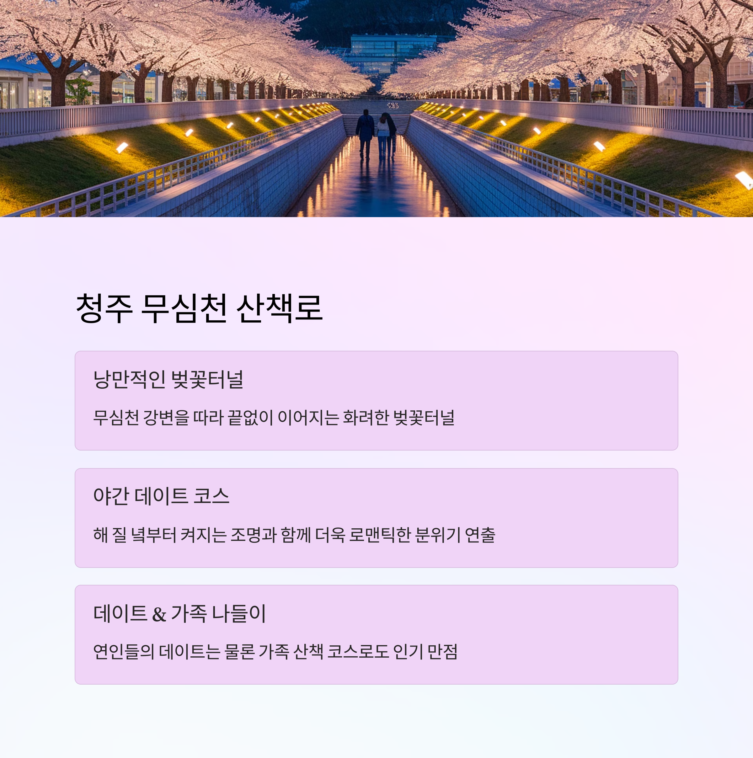 청주 무심천은 도심 속에서 즐기는 벚꽃 산책로로, 약 3.5km에 달하는 벚꽃길이 강변을 따라 이어집니다. 걷기뿐만 아니라 자전거 타기 좋은 길로도 유명하며, 매년 봄 청주 푸드트럭 축제와 함께 다양한 먹거리와 즐길 거리까지 함께 만끽할 수 있습니다. 해 질 무렵 붉은 석양과 벚꽃이 어우러지는 풍경은 청주 시민들에게는 봄의 상징이기도 하죠. 접근성도 뛰어나 당일치기 코스로도 인기가 높습니다.