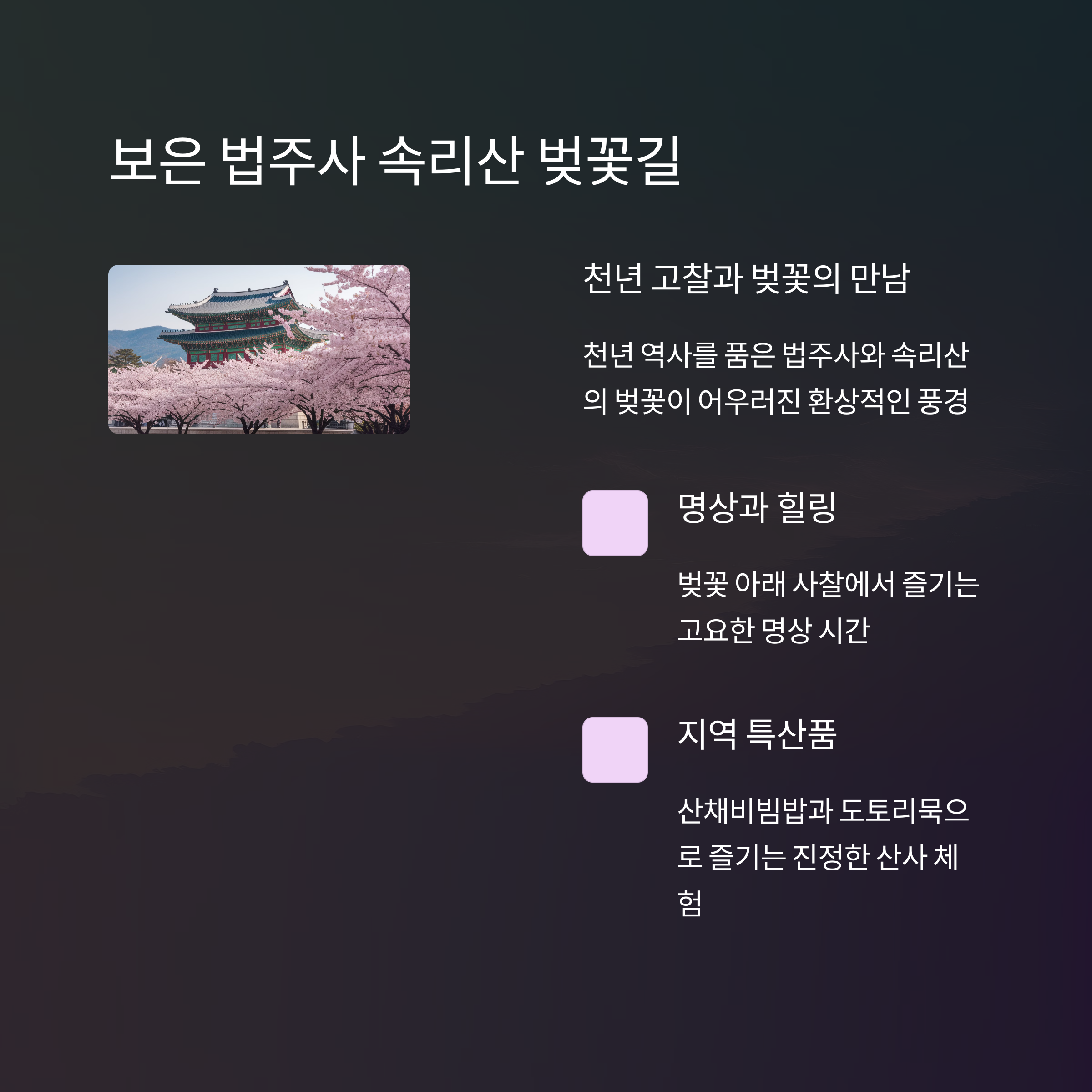 | 역사와 벚꽃이 어우러진 산책 코스 | 속리산 국립공원 내 자연 힐링 사찰 | 벚꽃, 목련, 튤립 모두 담긴 자연 명소 |