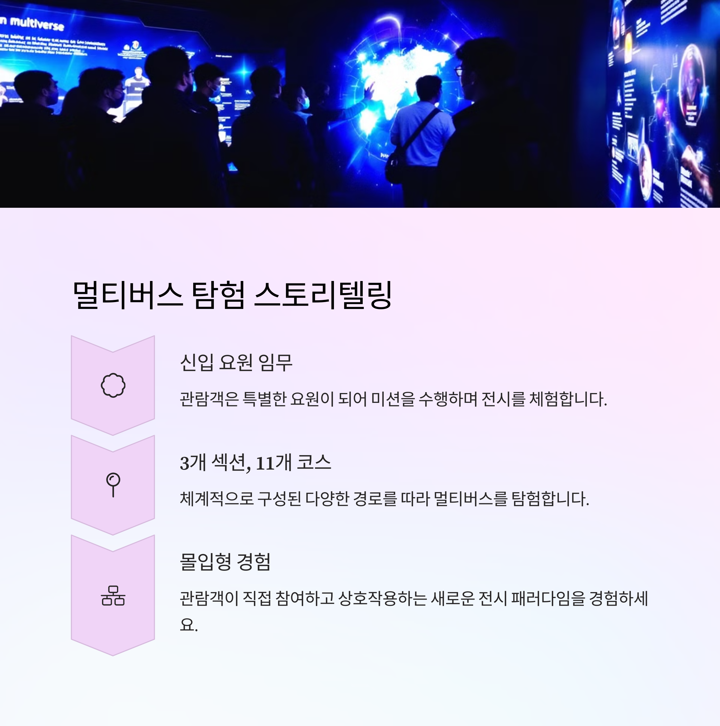 | 전시 특징 | 미디어아트 기반의 몰입형 체험 + 임무수행 콘텐츠 |