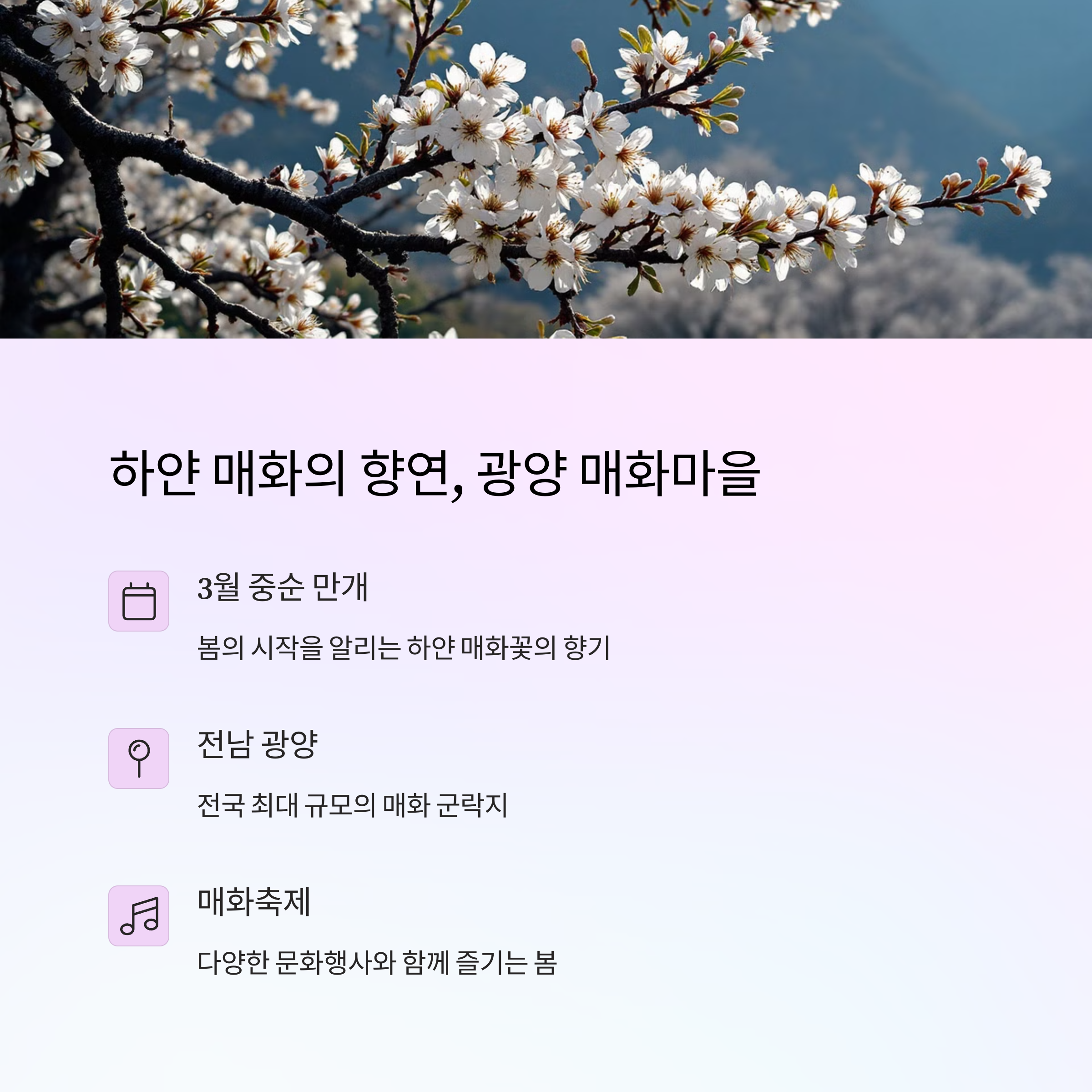 | 광양 매화마을 | 3월 중순, 매화 향기와 하동 섬진강 풍경 |