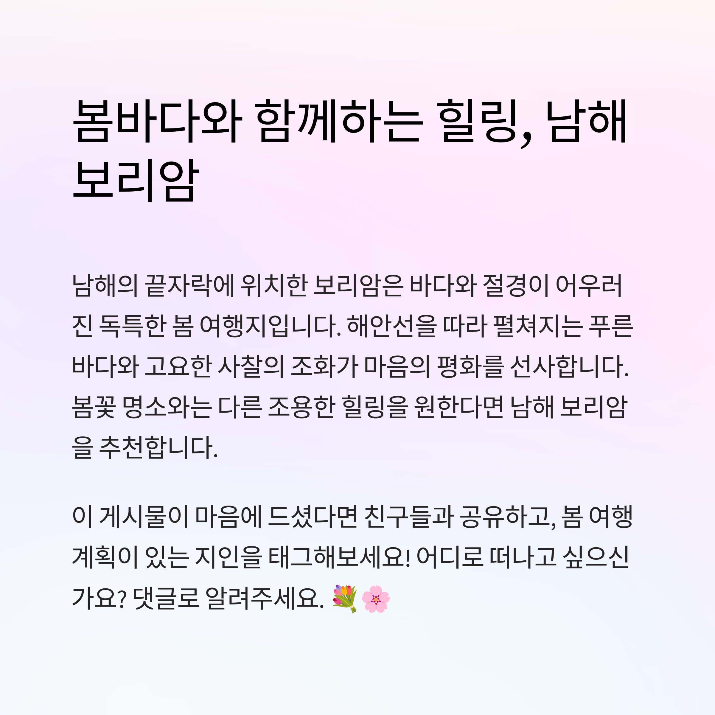 따스한 햇살과 함께 봄이 다가오는 3월, 어디론가 떠나고 싶은 설렘이 차오르기 시작합니다. 꽃들이 하나둘 피어나고, 바람에 실린 봄 향기가 여행 욕구를 자극하는 이 시기! 전국 곳곳에는 3월에만 만날 수 있는 특별한 풍경들이 펼쳐집니다. 이번 포스트에서는 봄의 기운을 가장 먼저 느낄 수 있는 국내 3월 추천 여행지 7곳을 소개해드릴게요. 매화, 유채꽃, 산수유, 벚꽃 등 다양한 봄꽃과 함께 낭만 가득한 봄 여행지를 찾고 있다면 꼭 참고해보세요!