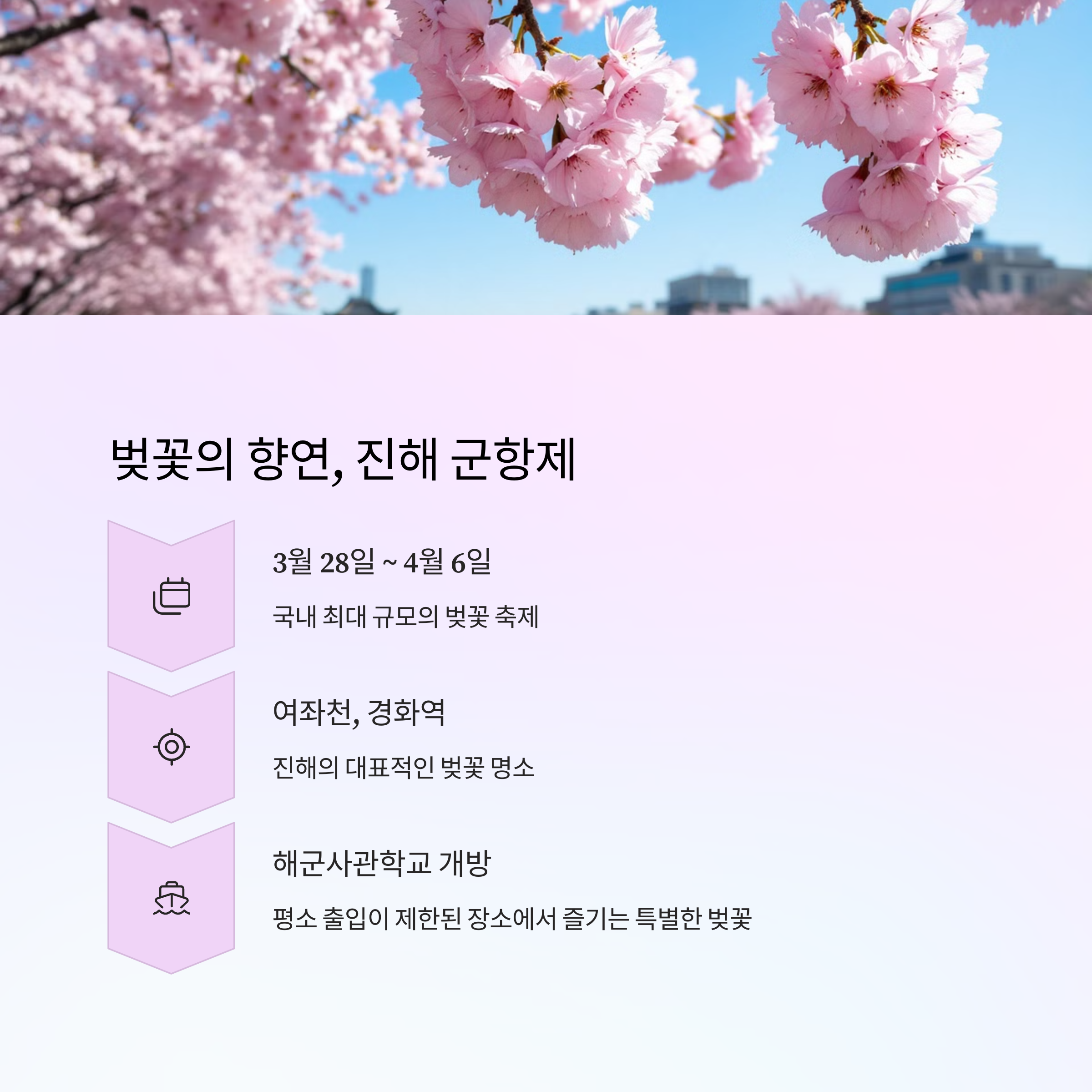 | 진해 군항제 | 국내 최대 벚꽃 축제, 3월 28일~4월 6일 |