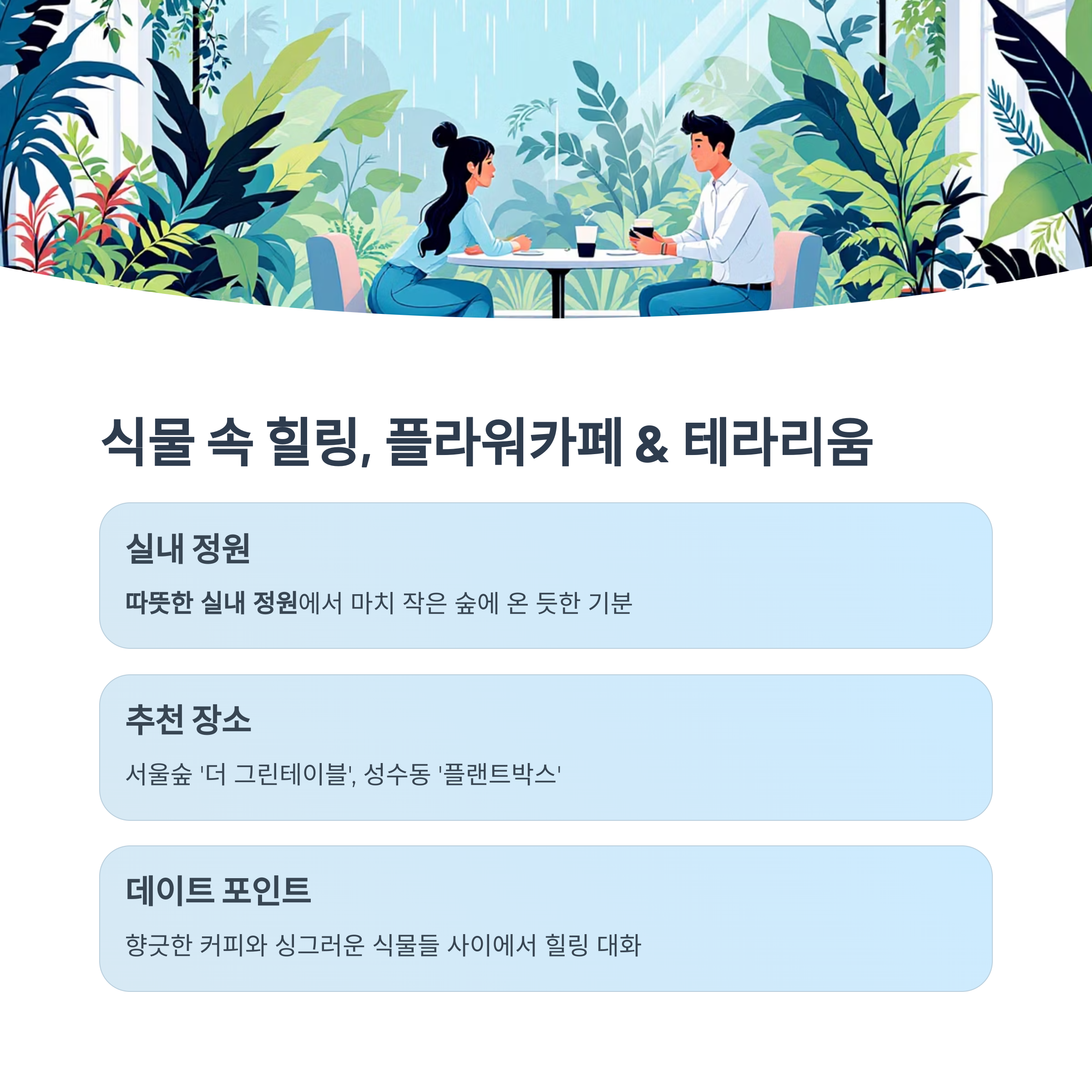 | 플라워카페 | 성수, 서울숲 | 식물 힐링, 향기 속 대화 |