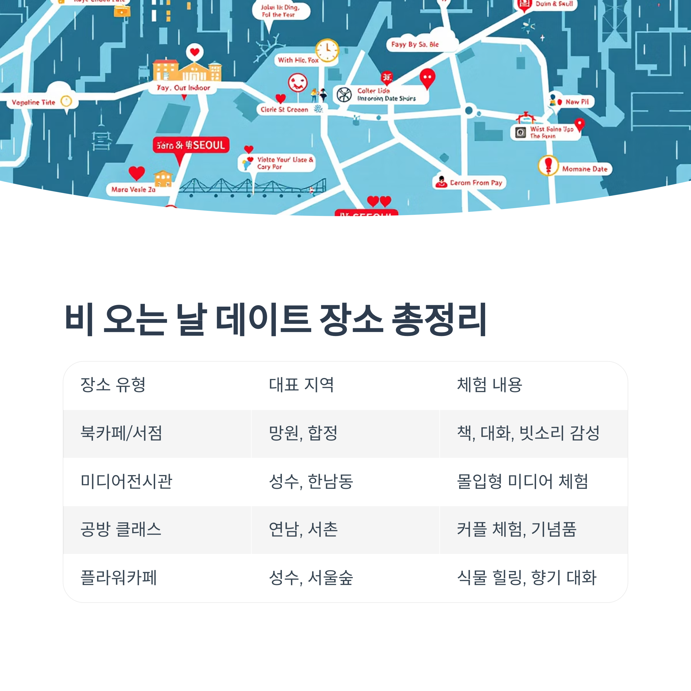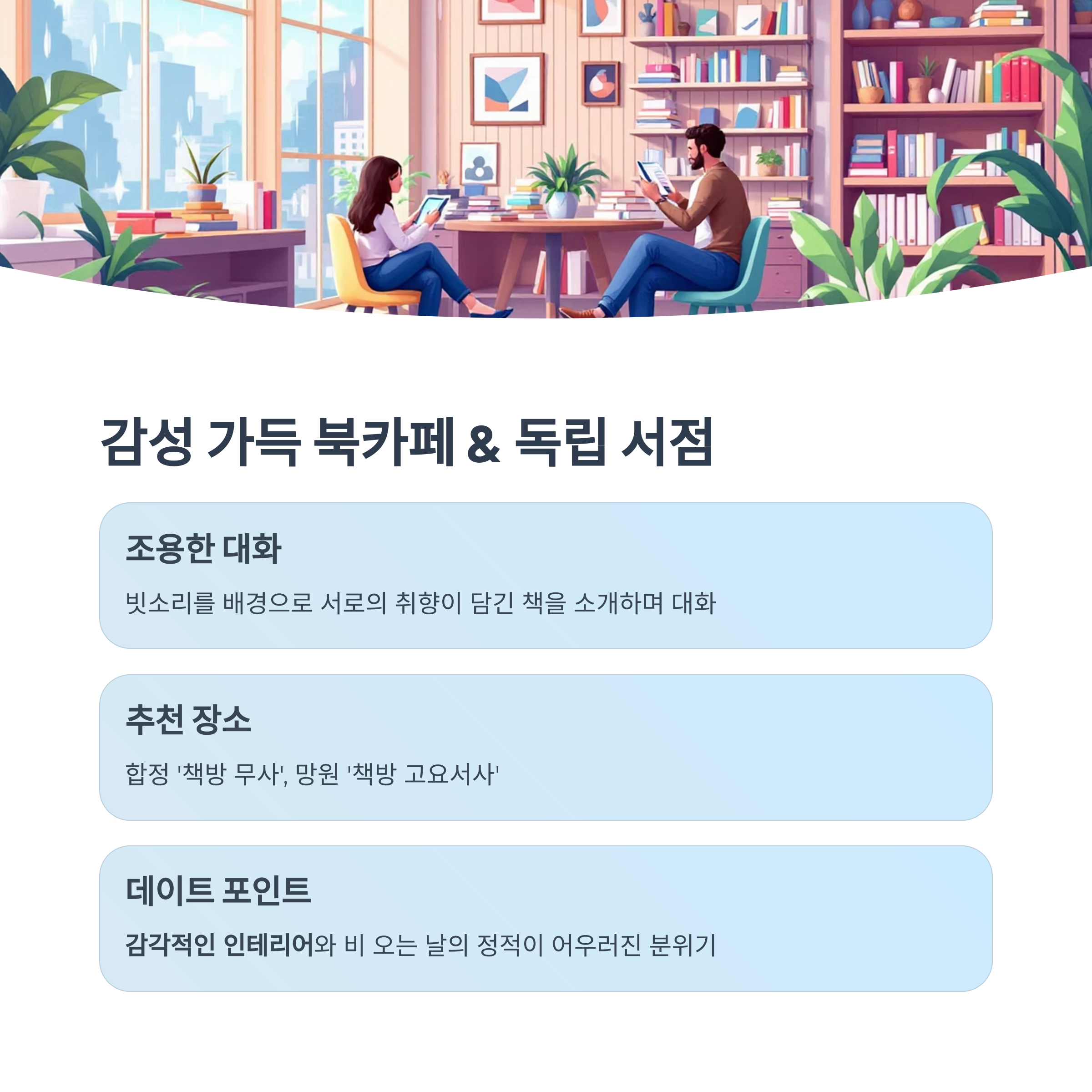 | 북카페/서점 | 망원, 합정 | 책, 대화, 빗소리 감성 공유 |