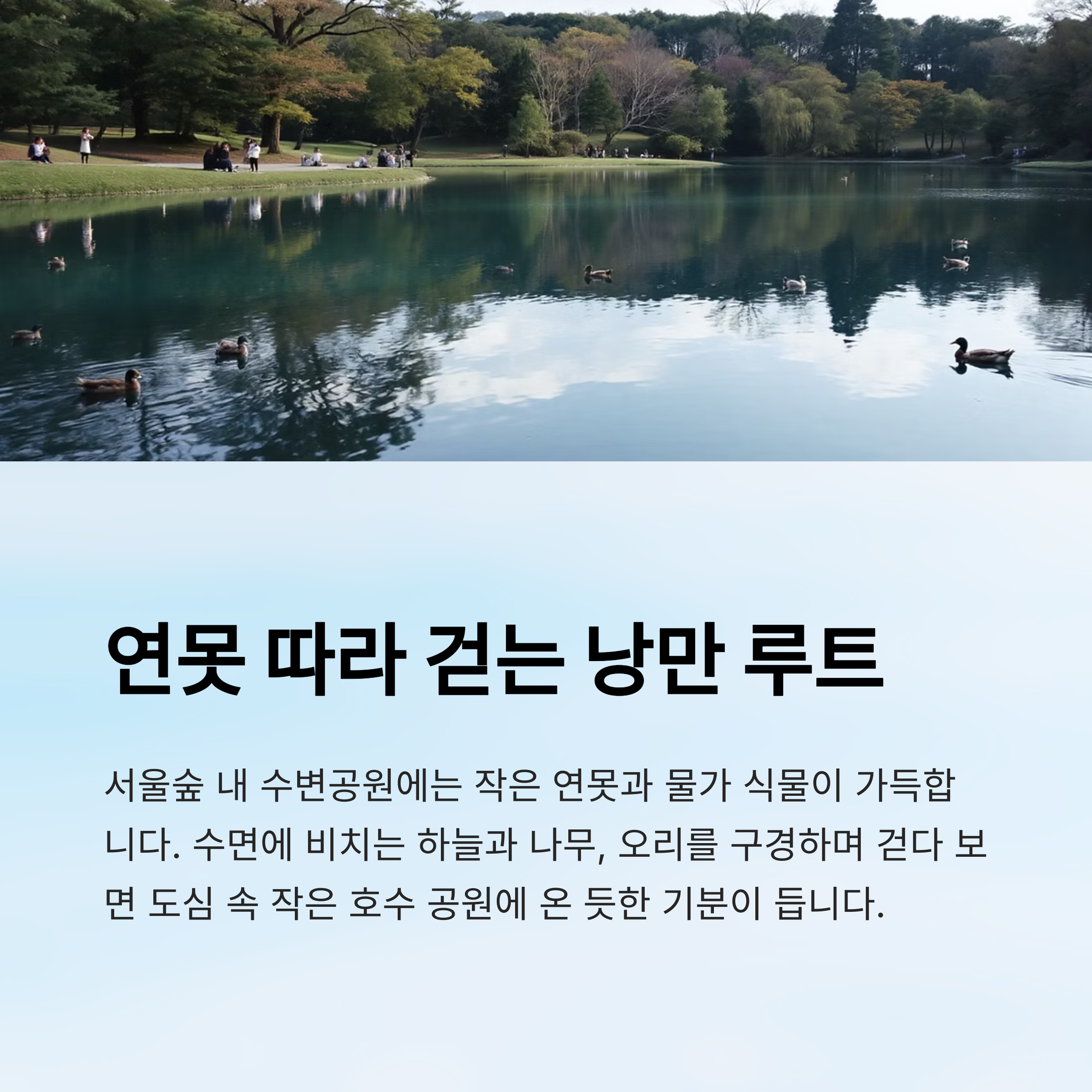수면에 비치는 하늘과 나무, 그리고 오리를 구경하며 걷다 보면
