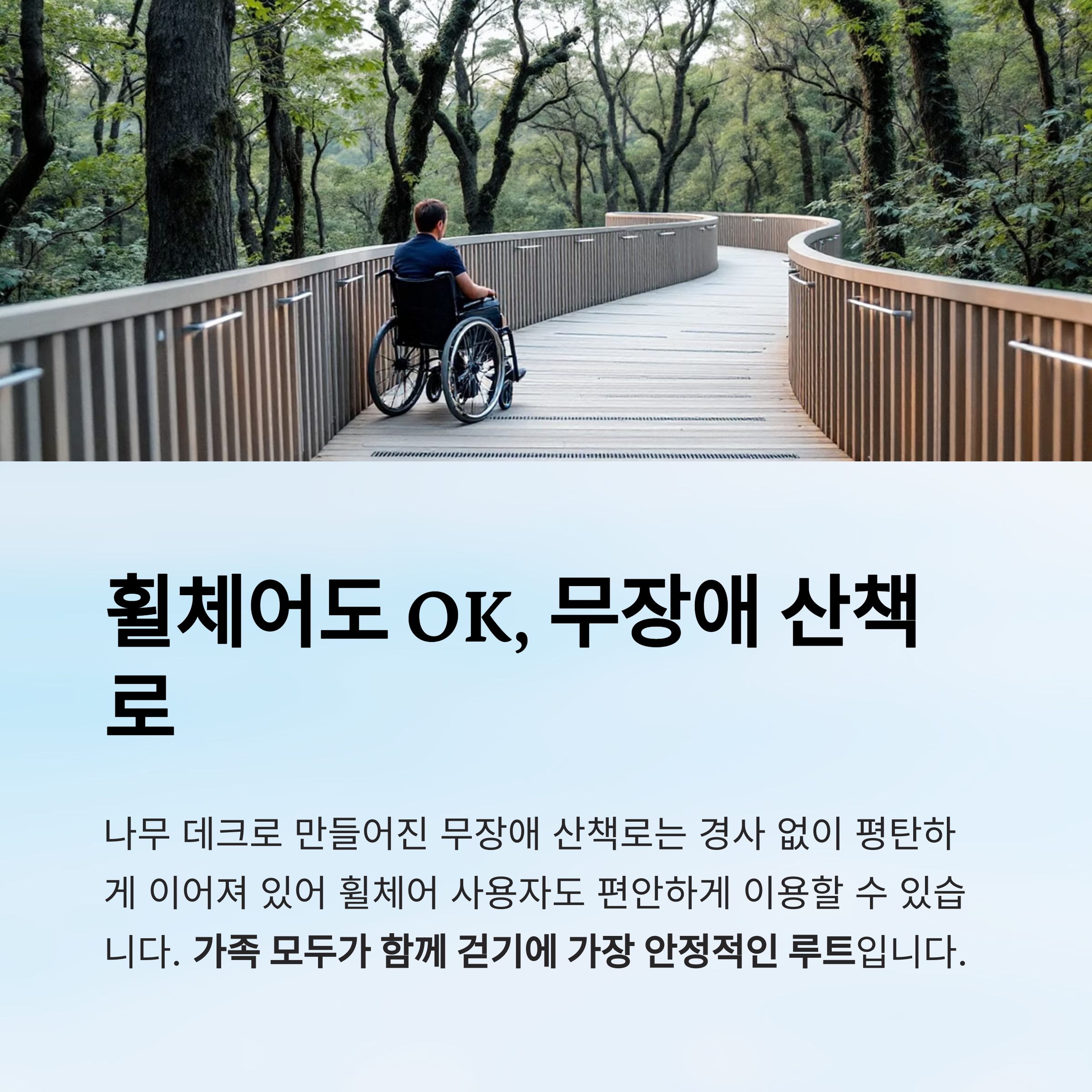 | 나무데크 무장애길 | 휠체어 가능, 경사 없음 | 노약자, 장애인 포함 가족 |