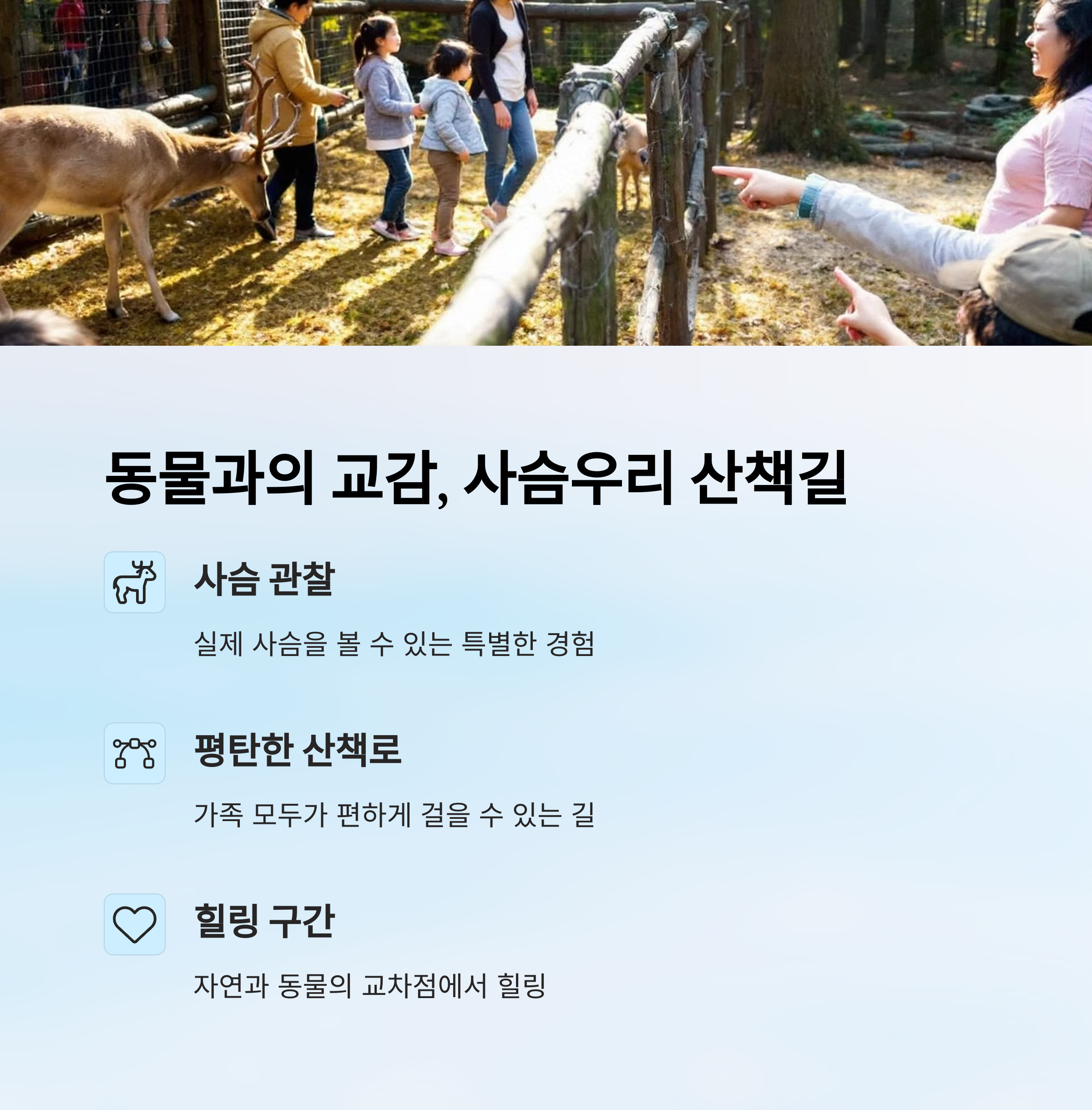 | 사슴우리 인근 | 동물 교감 가능 | 어린이 동반 가족 |
