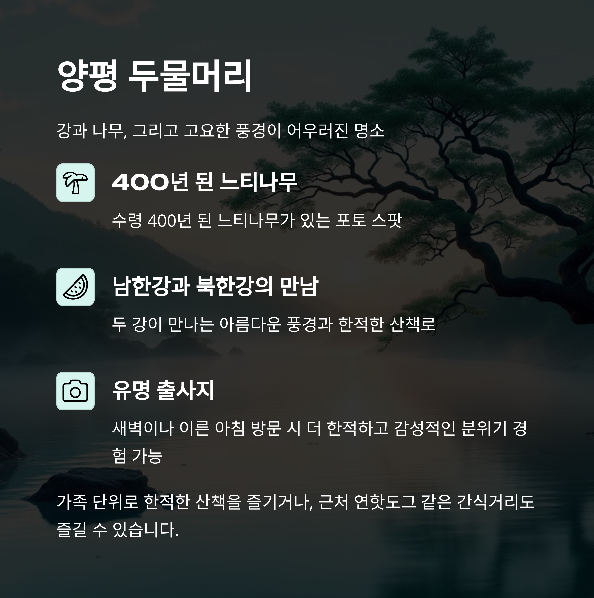 강과 나무, 그리고 고요한 풍경이 어우러진 명소