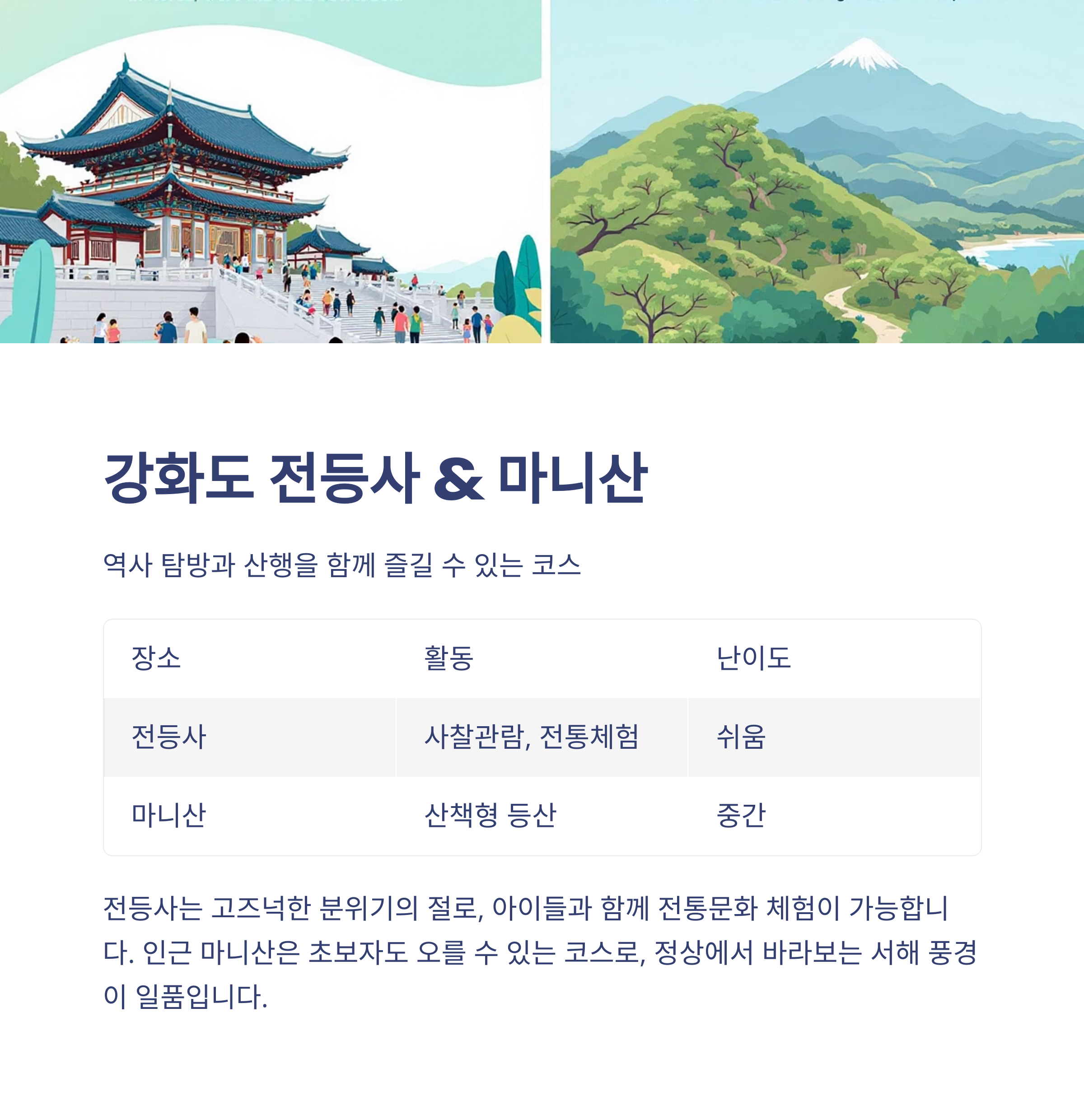 | 전등사 | 사찰관람, 전통체험 | 쉬움 |