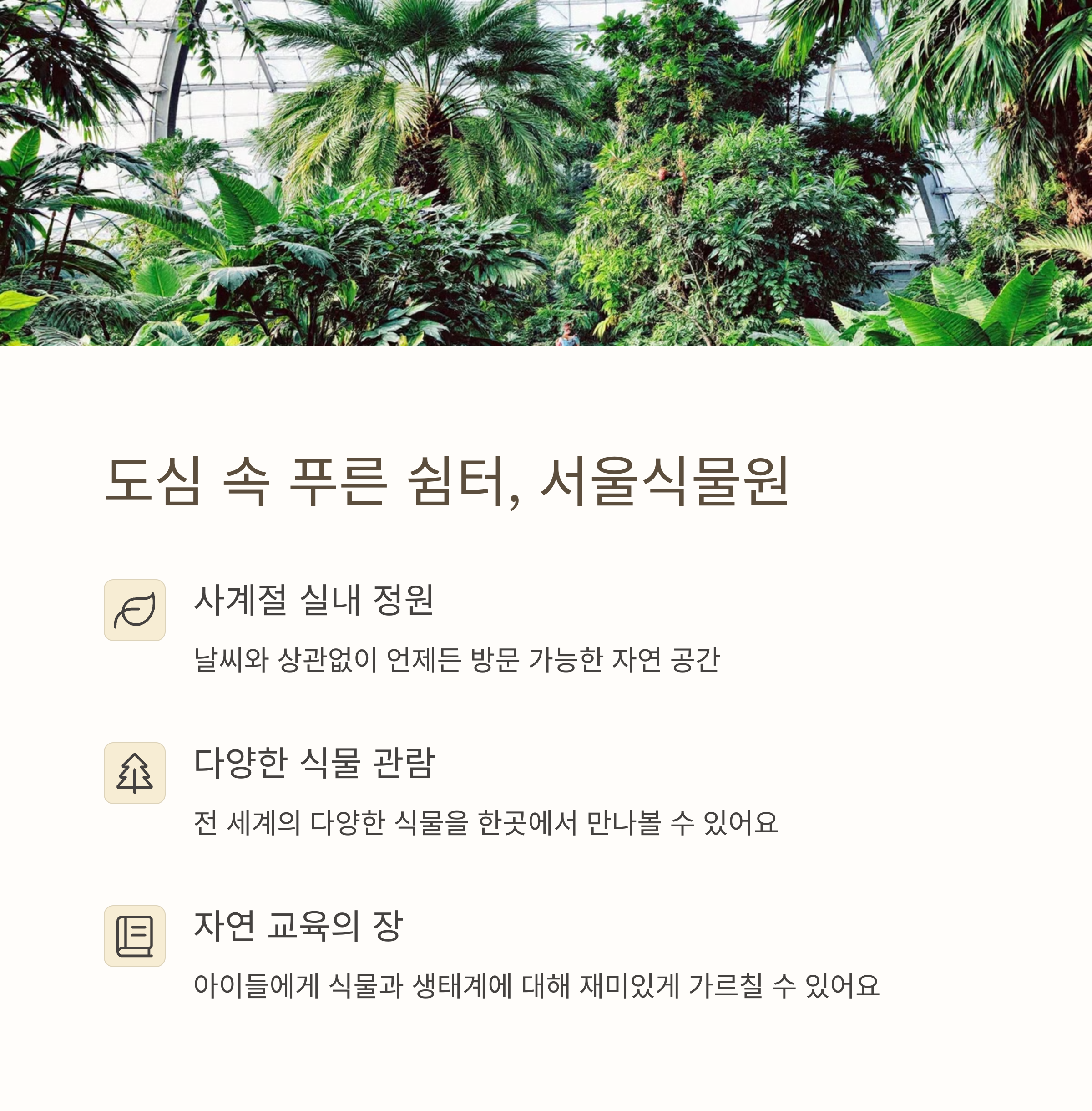 | 서울식물원 | 실내 온실에서 계절 상관 없이 식물 탐험 |