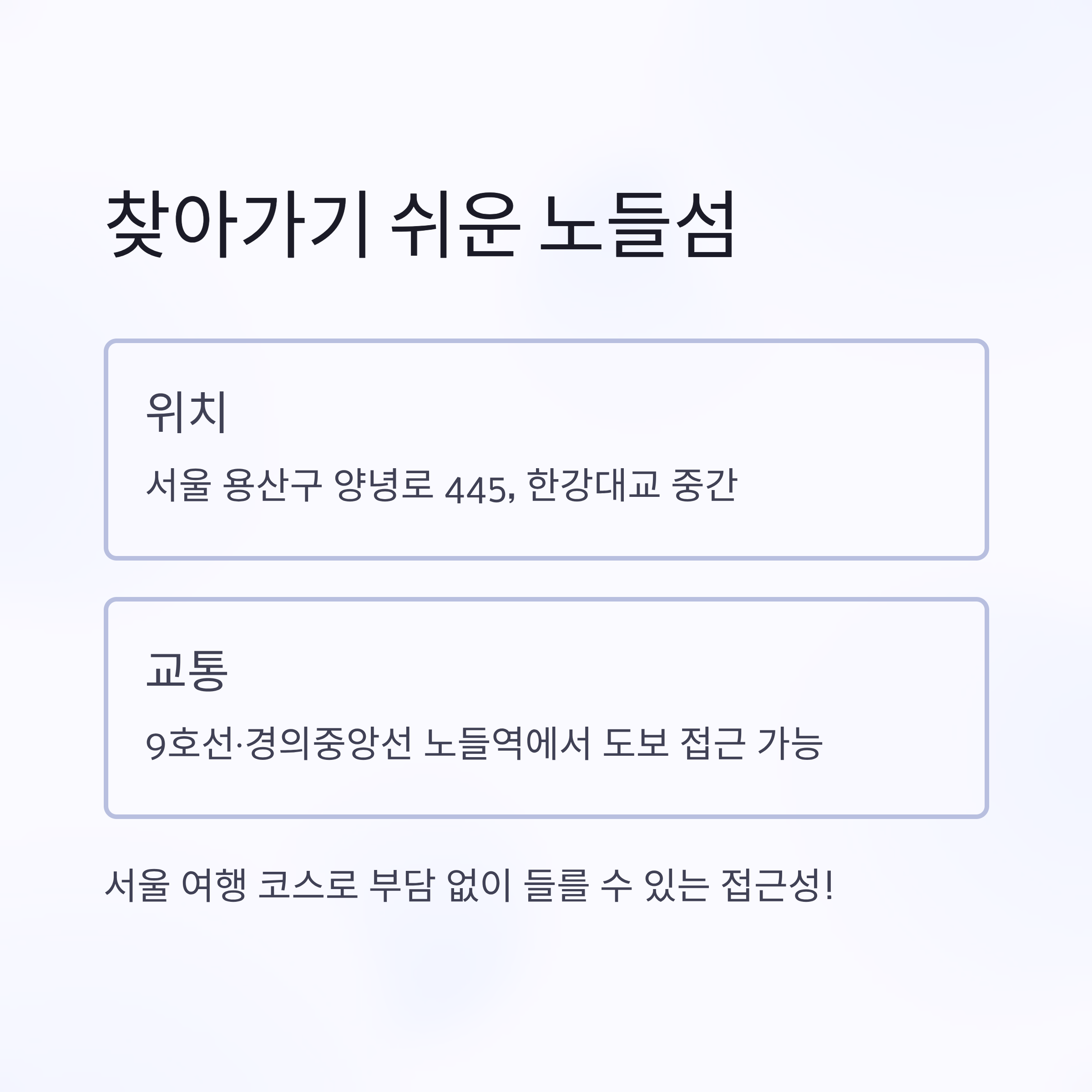 노들섬은 서울 용산구 양녕로 445, 한강대교 중간에 위치해 있습니다. 지하철 9호선과 경의중앙선 노들역에서 도보로도 쉽게 접근할 수 있어 서울 여행 코스로 부담 없이 들를 수 있습니다.