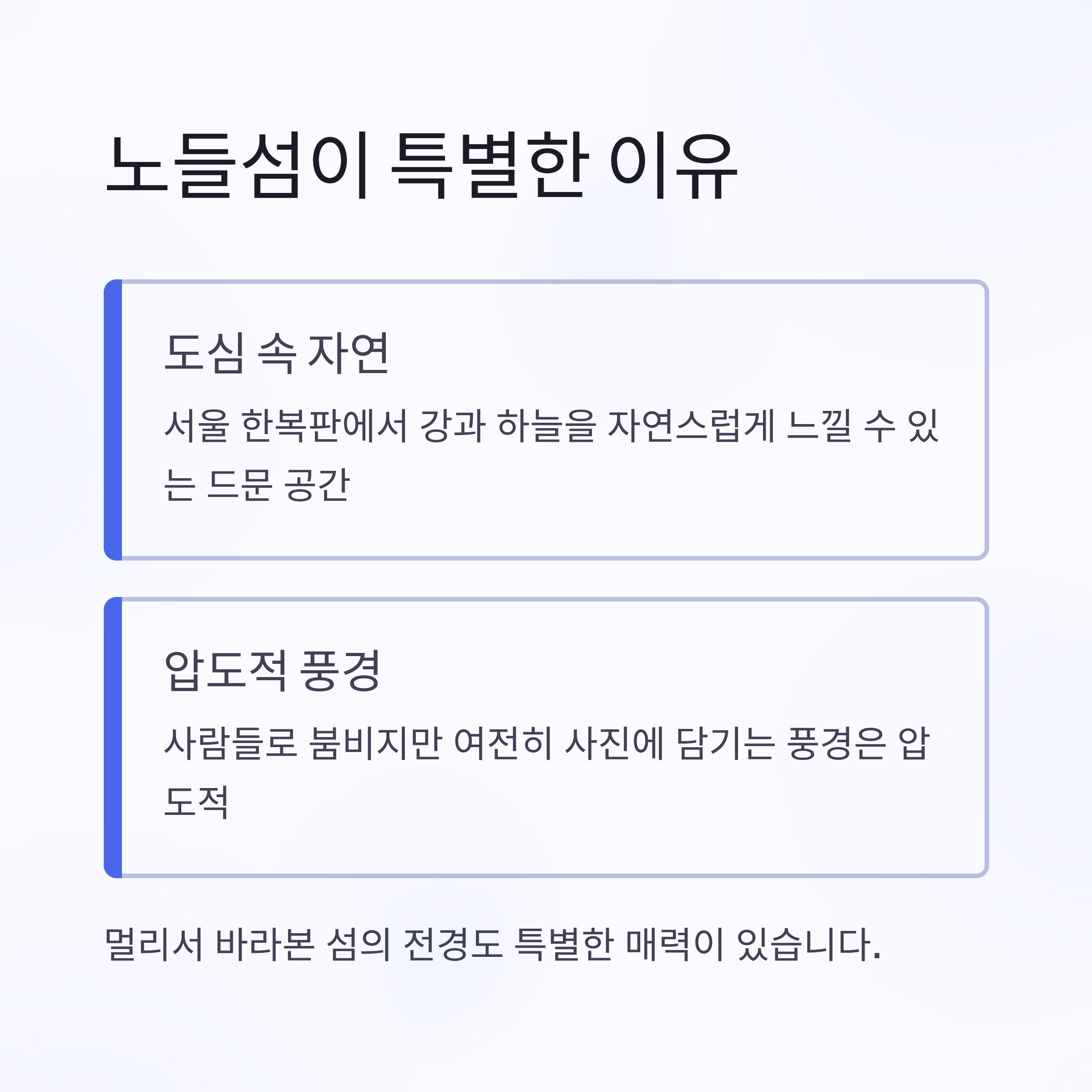서울 도심에서 이렇게 자연스럽게 강과 하늘을 느낄 수 있는 공간은 드뭅니다. 사람들로 붐비지만 여전히 사진에 담기는 풍경은 압도적이고, 멀리서 바라본 섬의 전경도 특별한 매력을 줍니다.